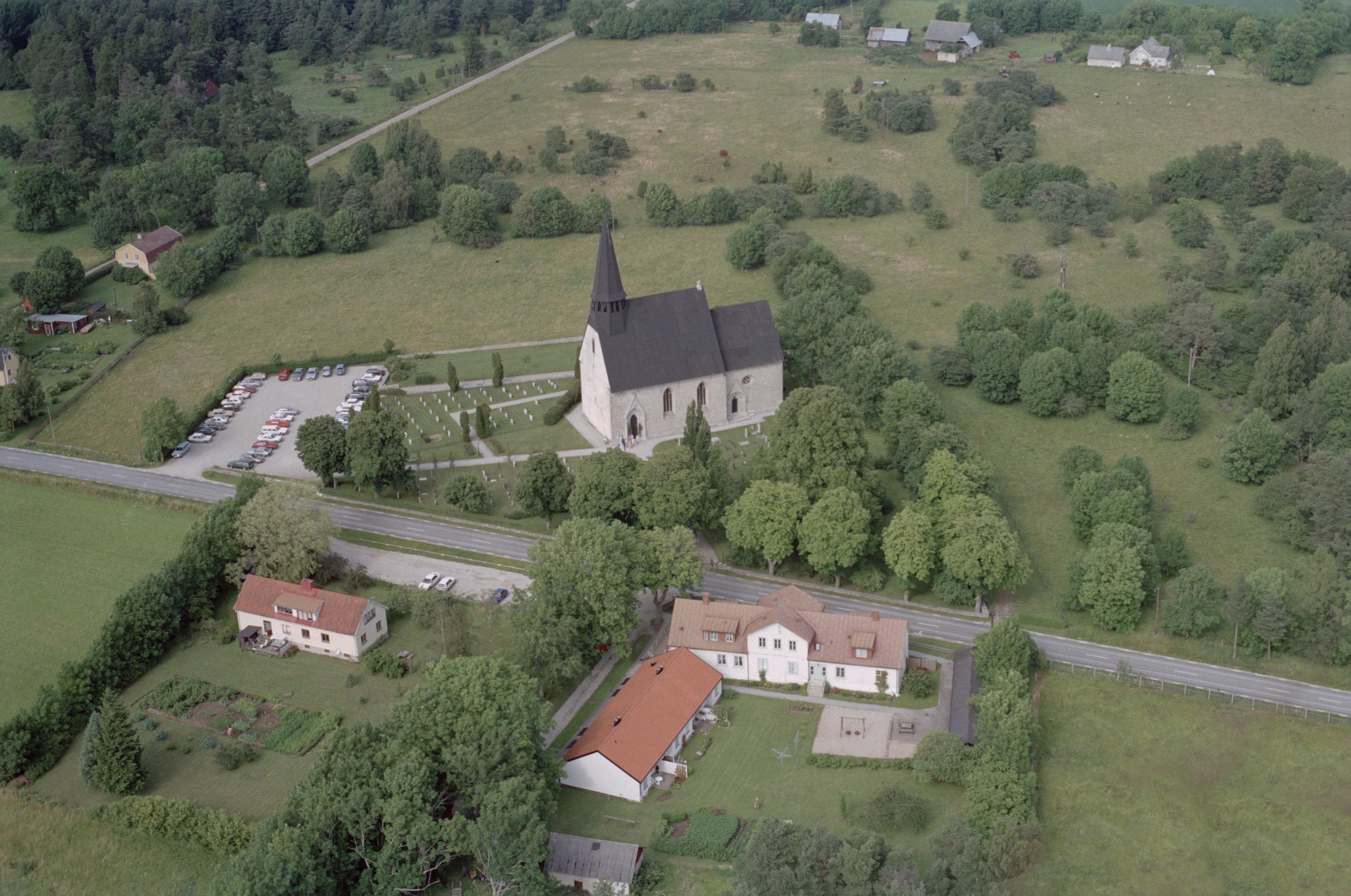 Beskrivning: Väte kyrka och kyrkby. I bildens nedre kant fornborg RAÄnr Väte 89:1. Till höger om kyrkan bytomt RAÄnr Väte 90:1. Bilden är tagen mot (väderstreck): NO