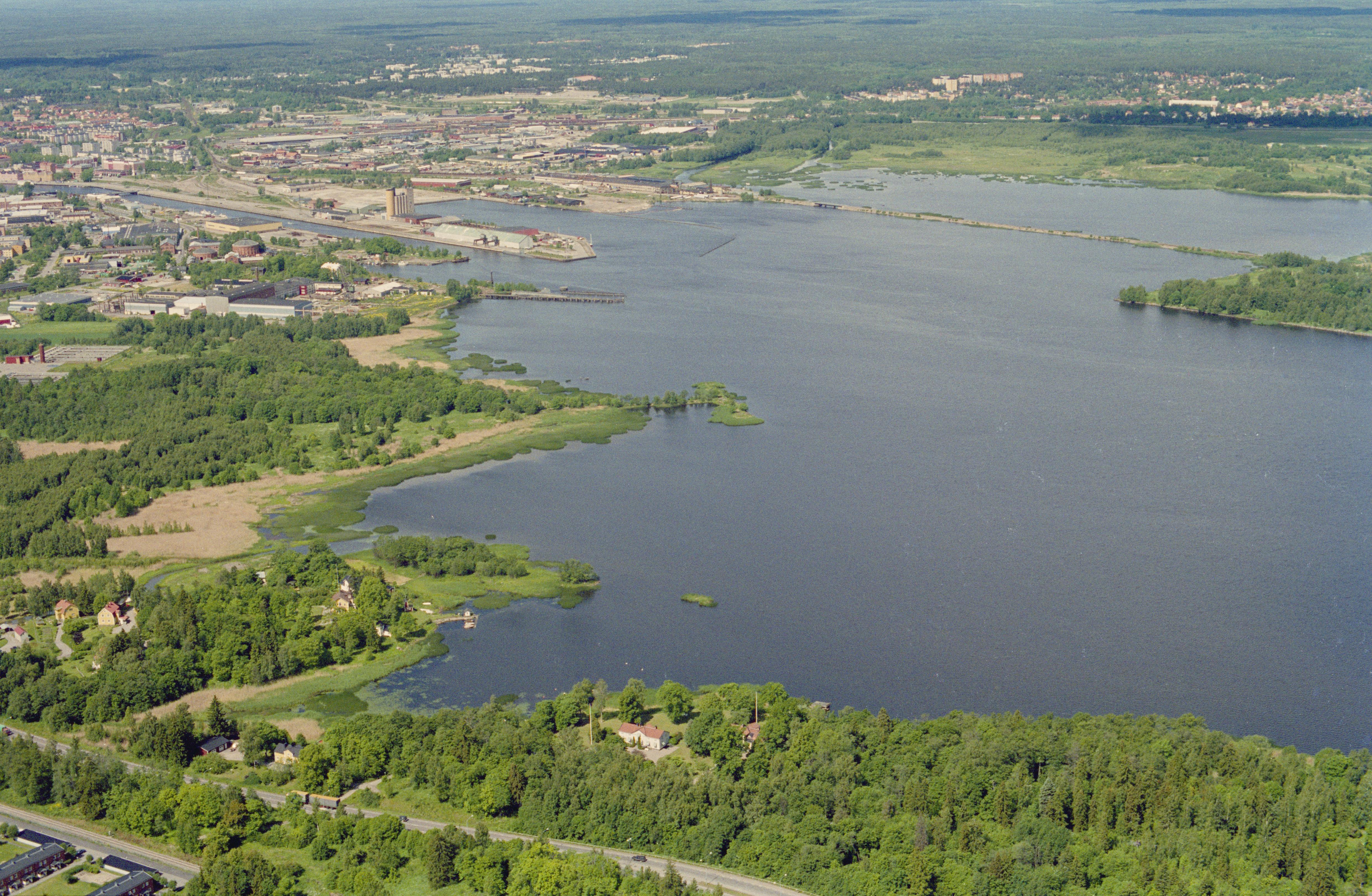 Beskrivning: Gävle tätort vid havsviken Inre fjärden. I bildens nedre del vägarna Österbågen och Nybergsallén söder om områdena Källö och Bomhus i tätortens östra del. Nere till vänster och vid bildens mitt T-uddens naturreservat med fäbodslämning RAÄnr Gävle 208:1. Uppe till vänster Gävle hamn m.m. Bilden är tagen mot (väderstreck): NV