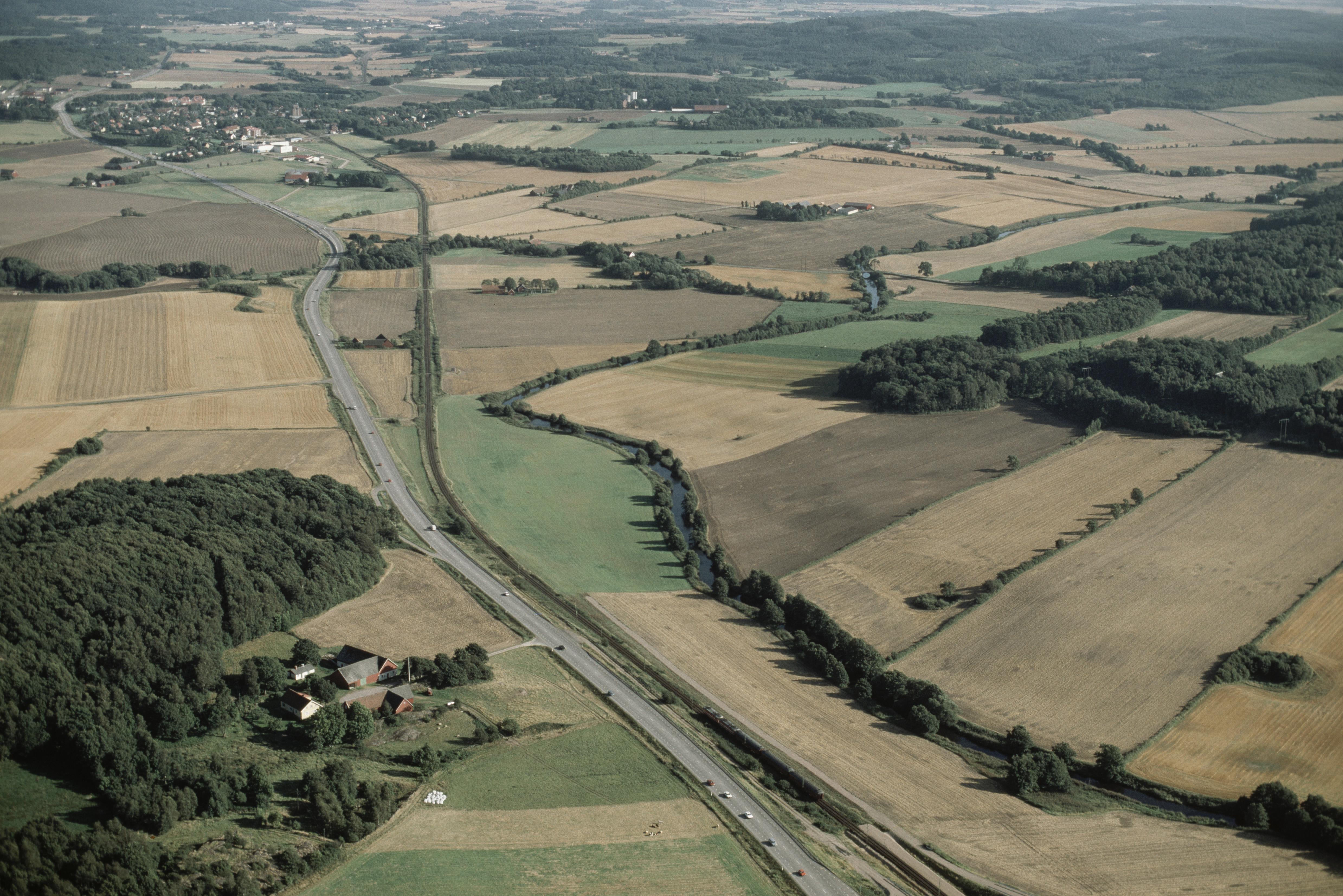 Beskrivning: Gravfält och Skotthögen RAÄnr Eftra 27:1 och 28:1 m.fl. i nere till vänster vid Hanarps gård. I bildens övre del Slöinge socken. Bilden är tagen mot (väderstreck): SO