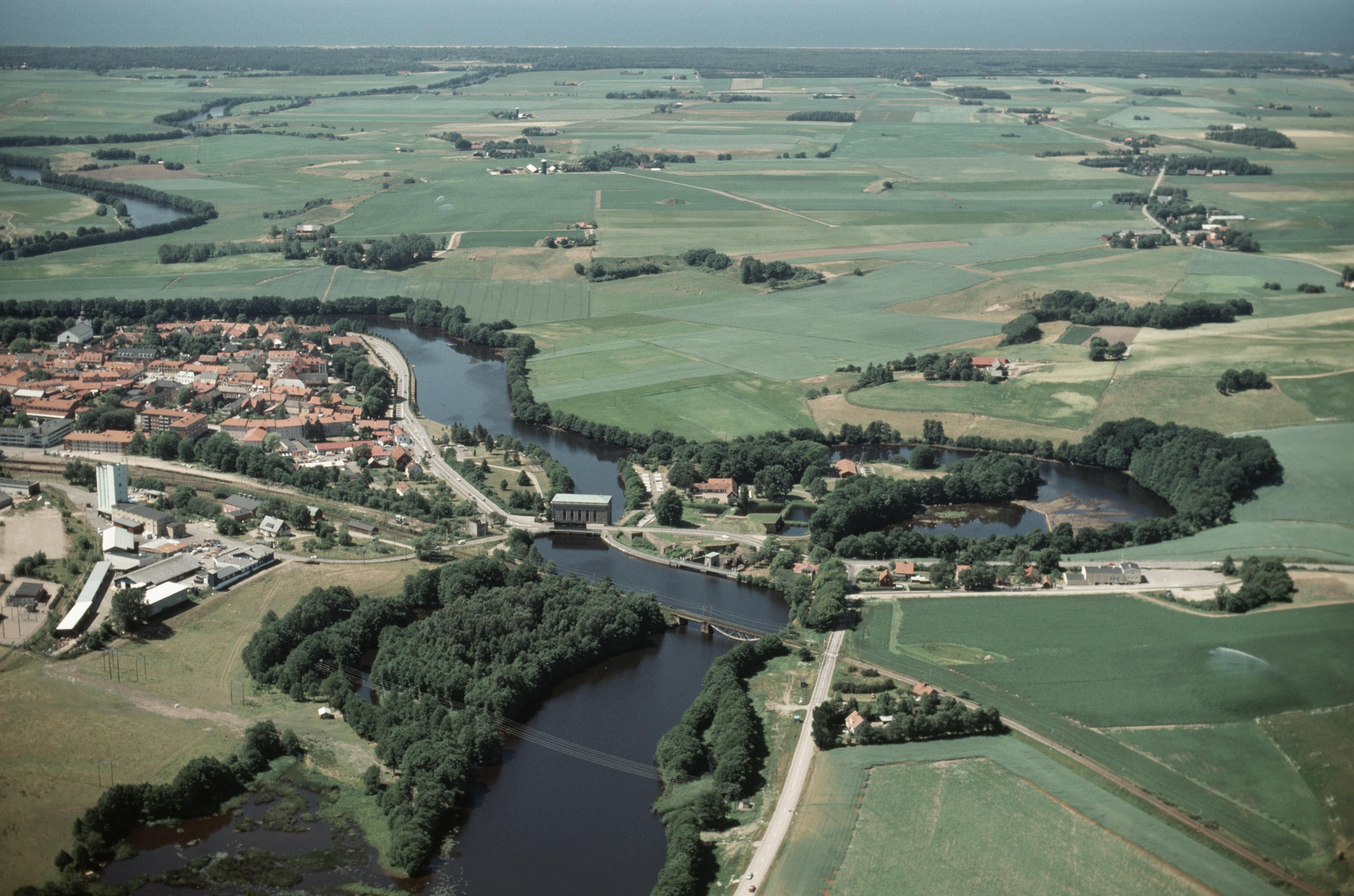 Beskrivning: Laholms stad med Lagaholm. Den medeltida staden och marknadsplatsen. Vid bildens mitt lämningar efter fästning RAÄnr Laholm 38:1 på Skansholmen i ån Lagan. Bilden är tagen mot (väderstreck): NV