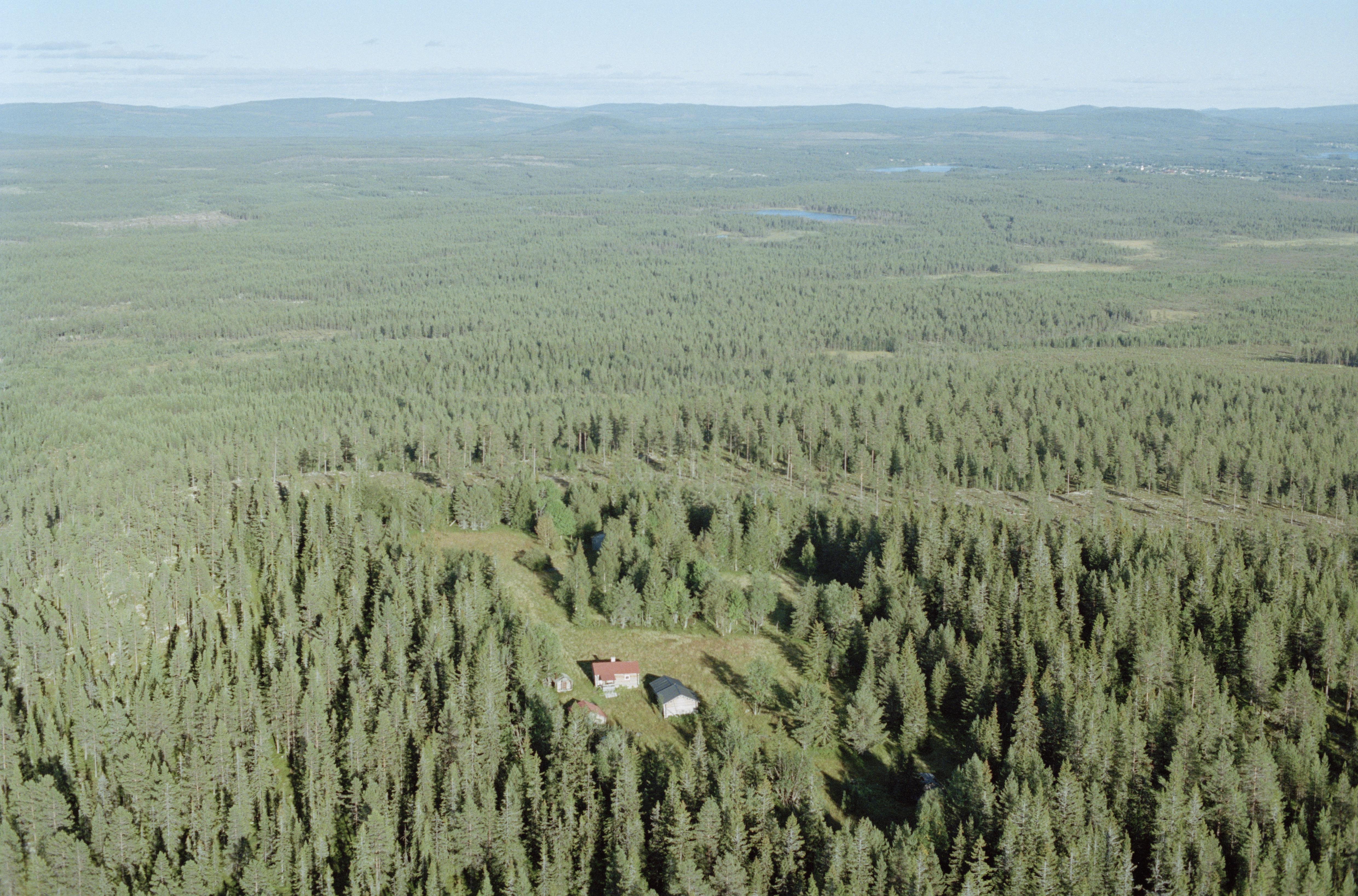 Beskrivning: Fäboden Bergsvallen. I skogen i bildens övre del blästblats RAÄnr Lillhärdal 129:1. Uppe till höger skymtas Kyrkbyn i Lillhärdal. Bilden är tagen mot (väderstreck): OSO
