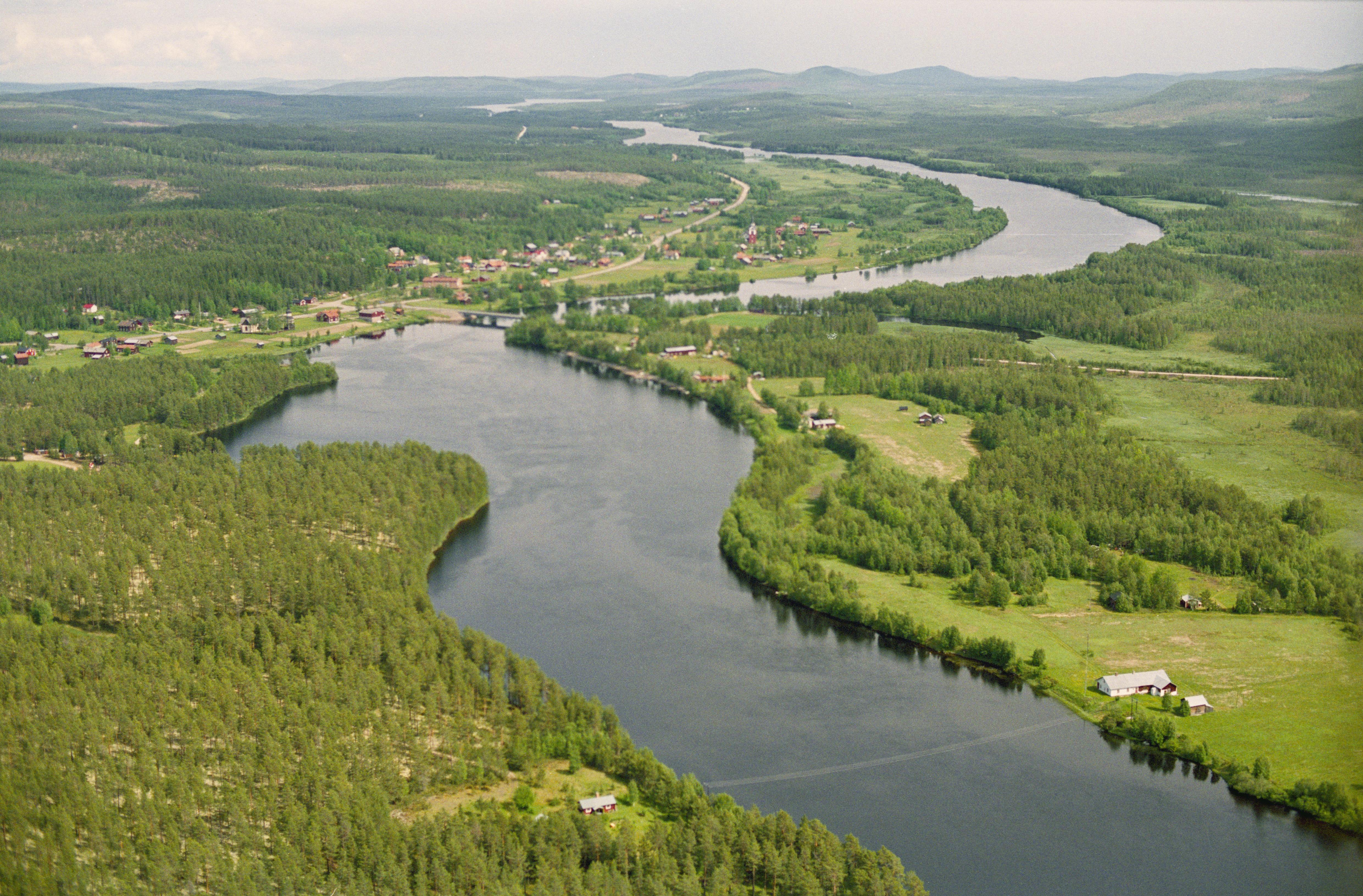 Beskrivning: Vid bildens mitt Norrälvens utlopp i älven Ljusnan vid Älvros kyrkby. Älvros gamla kyrka till vänster över bildens mitt, Älvros nya kyrka (Älvros kyrka) till höger över bildens mitt. I byn bytomt RAÄnr Älvros 464, 483, 465, 474, 484, 545 m.fl. Bilden är tagen mot (väderstreck): Ö