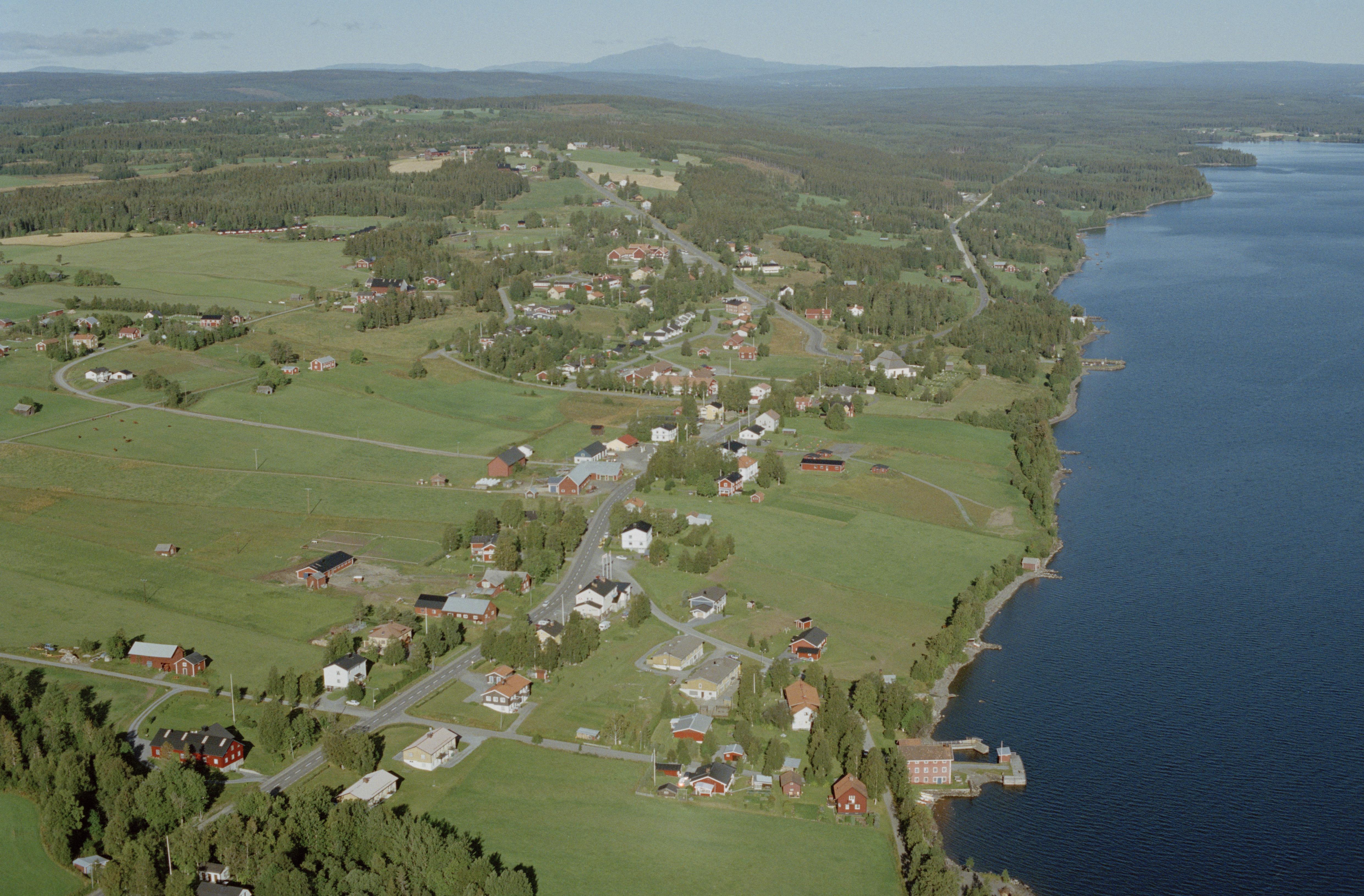 Beskrivning: Storsjön, västra delen vid Indalsälven. Hallens kyrkby med bytomt RAÄnr Hallen 144:1. Hallens kyrka till höger om bildens mitt. Till höger i bildens nedre del Sågbäcken utlopp i sjön. Bilden är tagen mot (väderstreck): NV