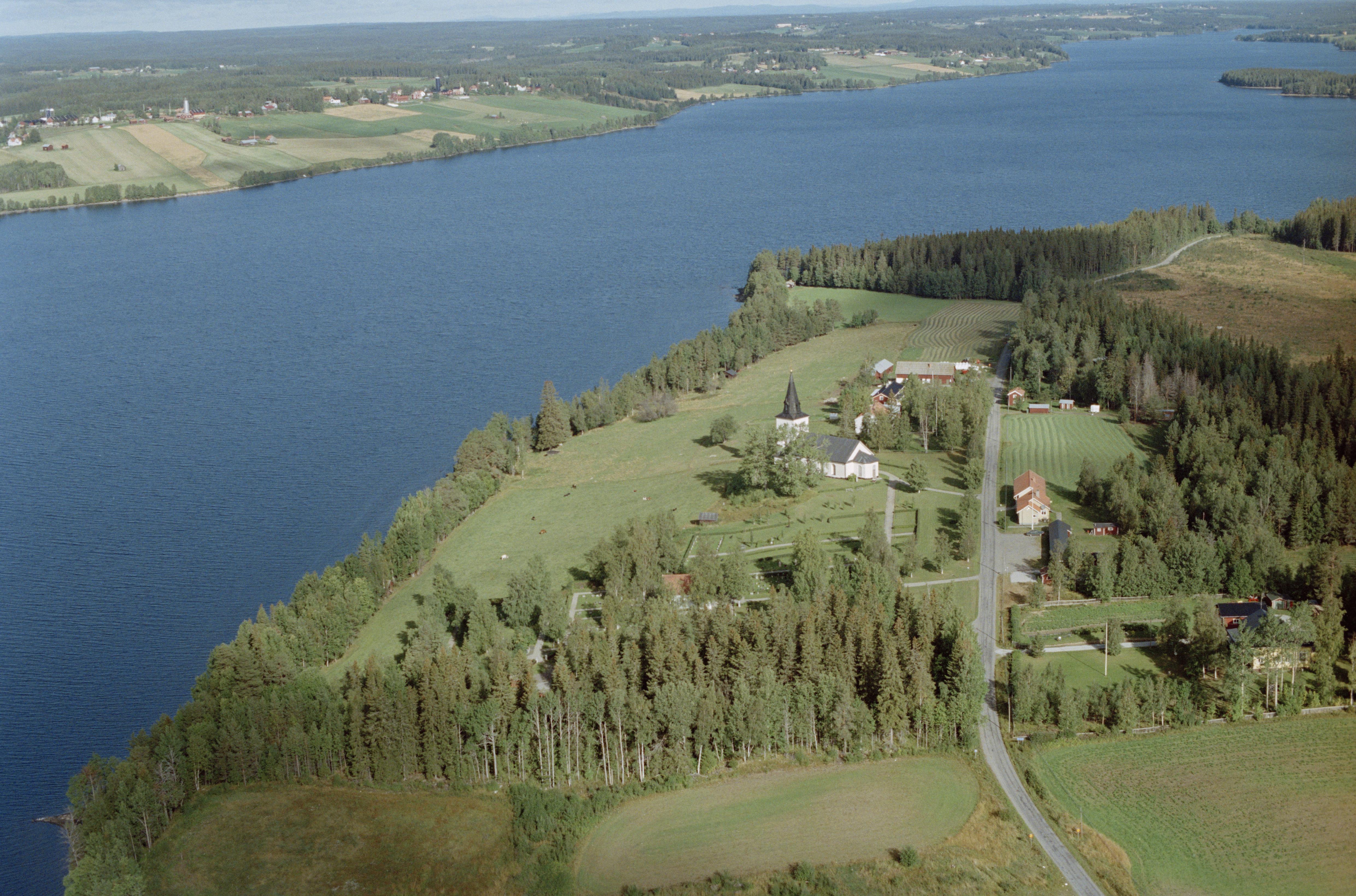 Beskrivning: Myssjö kyrkby vid Myrviken i Storsjön. Myssjö kyrka i bildens mitt. Vid kyrkan begravningsplats RAÄnr Myssjö 32:1 och bytomt Myssjö 336. Bilden är tagen mot (väderstreck): N