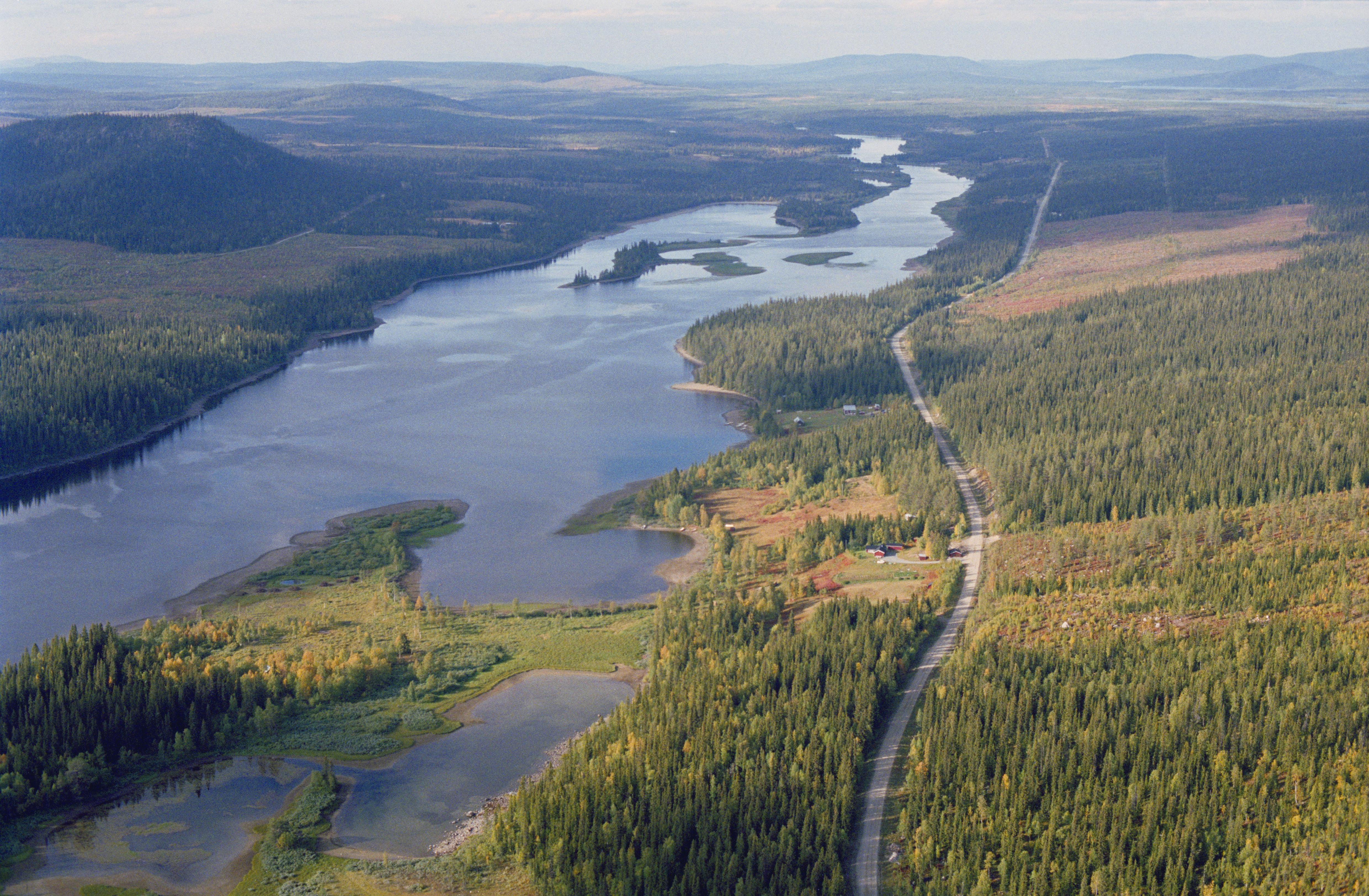Beskrivning: Laisälven (Lájsso) vid byn Persbacka. Vid stranden vid bildens mitt boplats RAÄnr Arjeplog 603:1-2. Bilden är tagen mot (väderstreck): NV