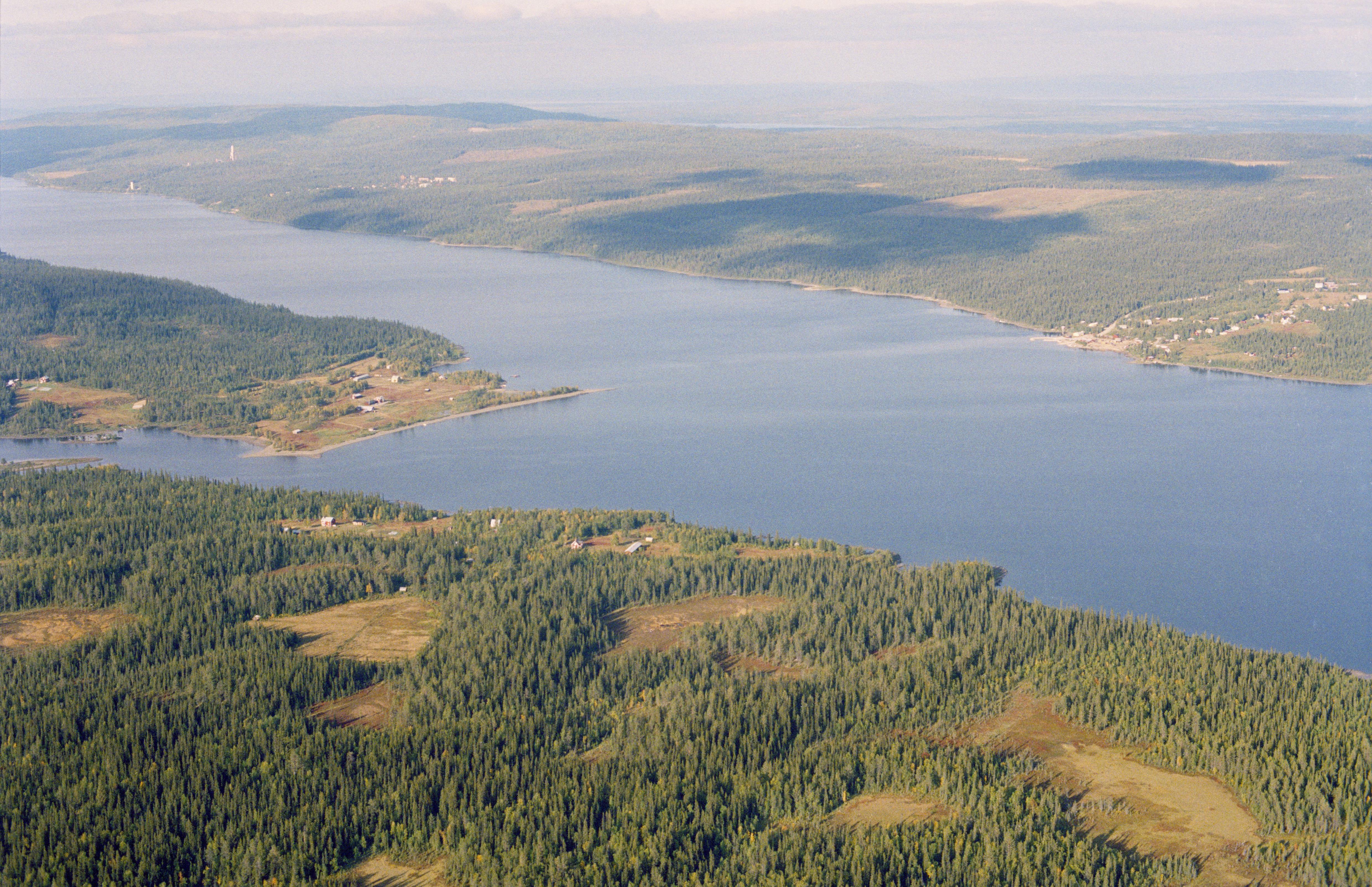 Beskrivning: Laisälven (Lájsso). I bildens nedre del områdena Kramaviken och Västra Laisvall. Till höger Laisvallby. Uppe till vänster gruvsamhället Laisvall (Lájsogädde). Vid Västra Laisvall till vänster om bildens mitt fossil åker RAÄnr Arjeplog 916:1, m.fl. Bilden är tagen mot (väderstreck): NO