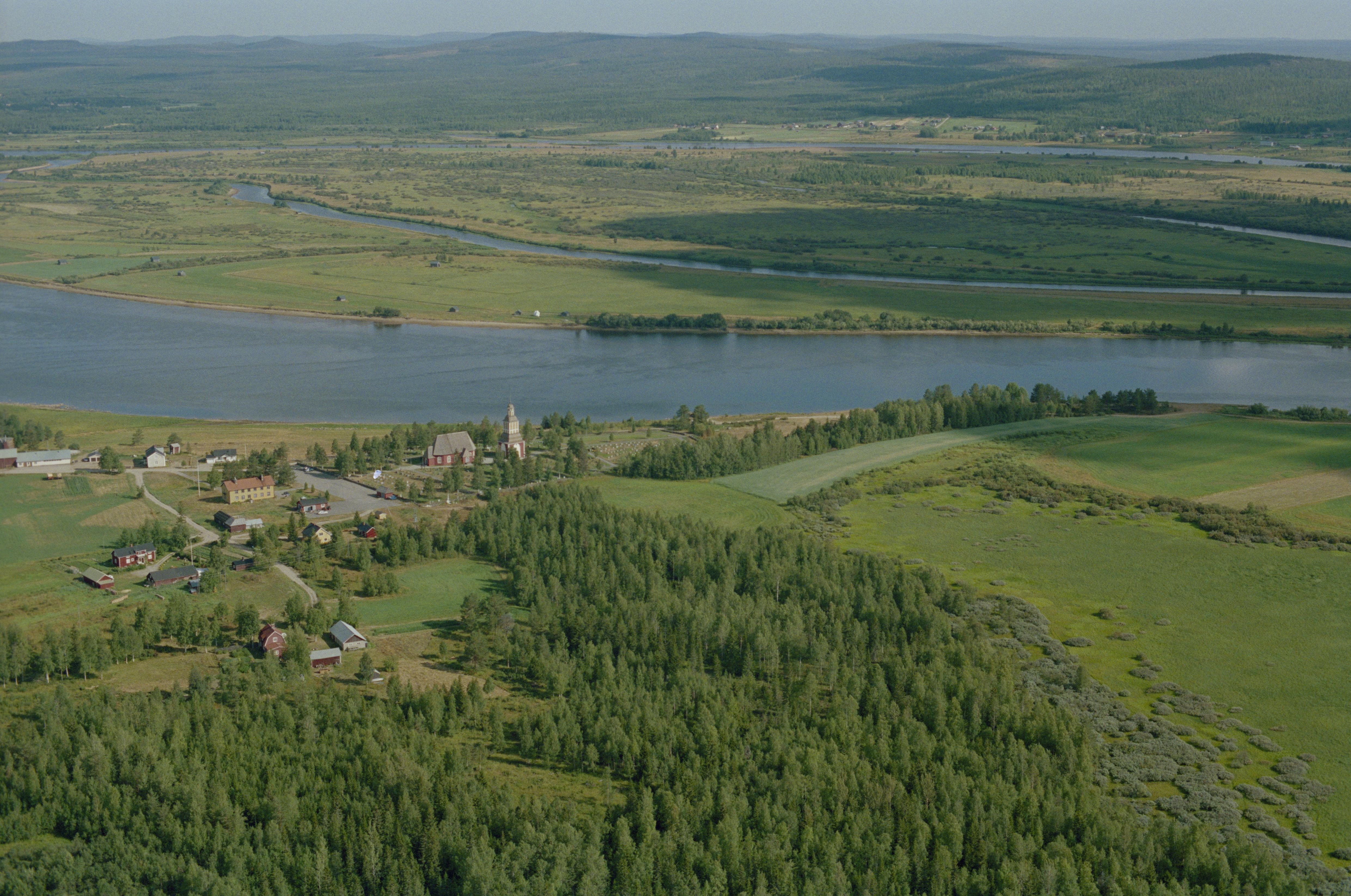Beskrivning: Hietaniemi kyrkby i orten Hedenäset vid Torneälven i Tornedalen. Hietaniemi kyrka till vänster under bildens mitt. Vid kyrkan bytomt RAÄnr Hietaniemi 326:1, gränsmärke Hietaniemi 61:1, m.m. Torneälven markerar riksgränsen mot Finland (i bildens övre del). Bilden är tagen mot (väderstreck): ONO