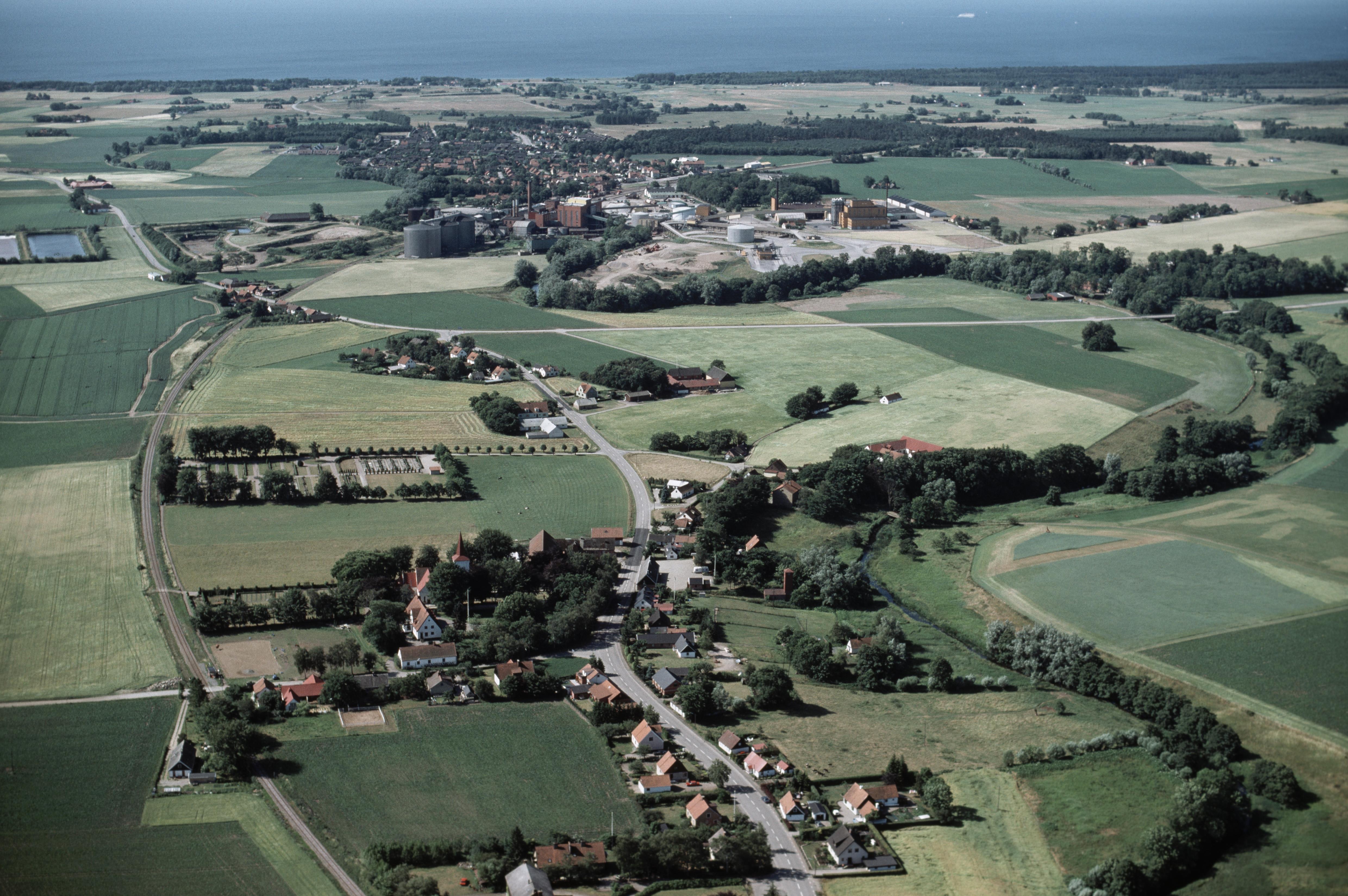 Beskrivning: Nybroån. Stora Köpinge kyrka nere till vänster om bildens mitt. I bildens övre del Köpingebro. Bilden är tagen mot (väderstreck): SSV