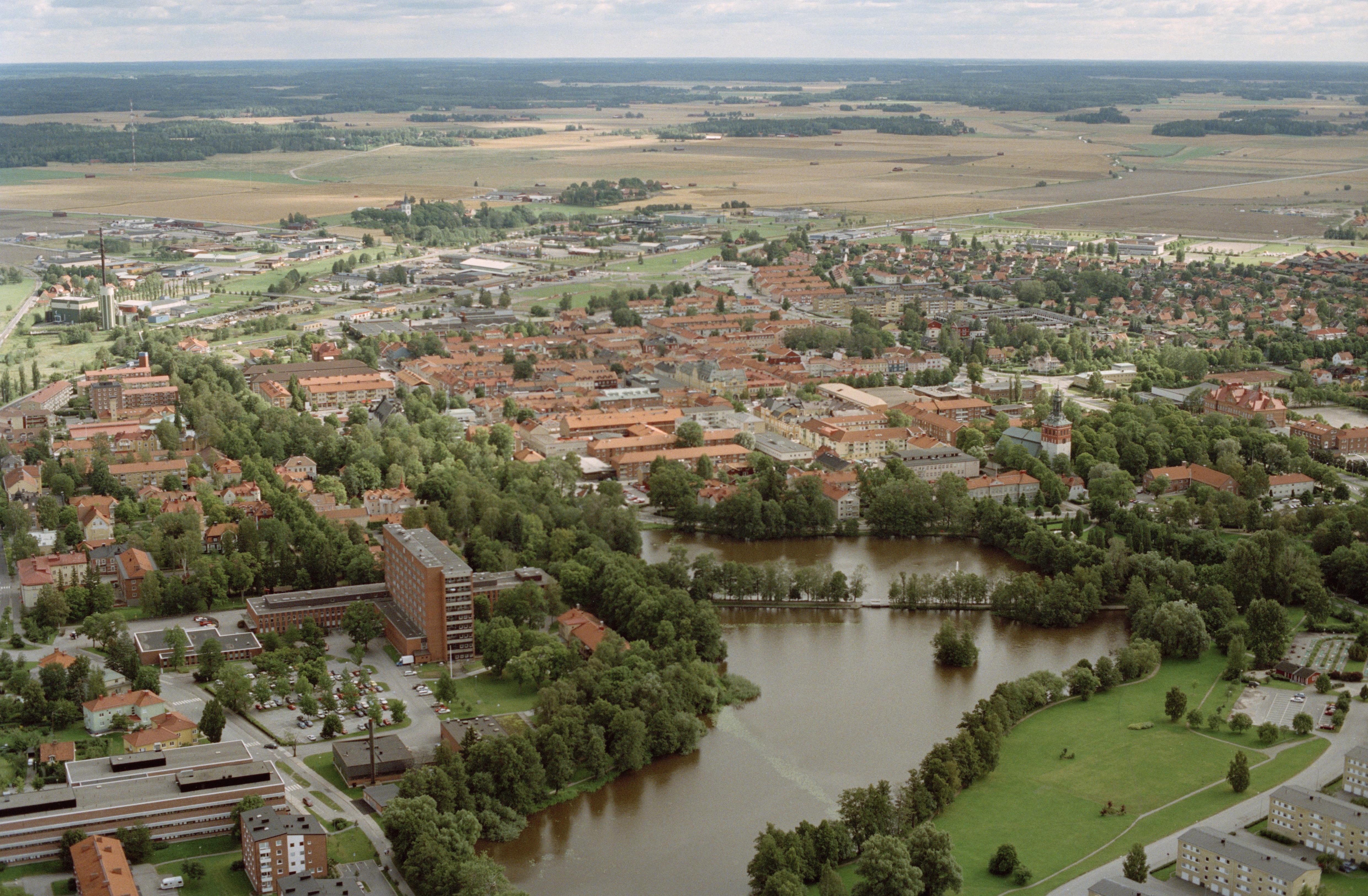 Beskrivning: Sala stad och stadskärna RAÄnr Sala stad 137:1. Till höger om bildens mitt Kristina kyrka vid Ekeby damm och. Lillån. Bilden är tagen mot (väderstreck): SO