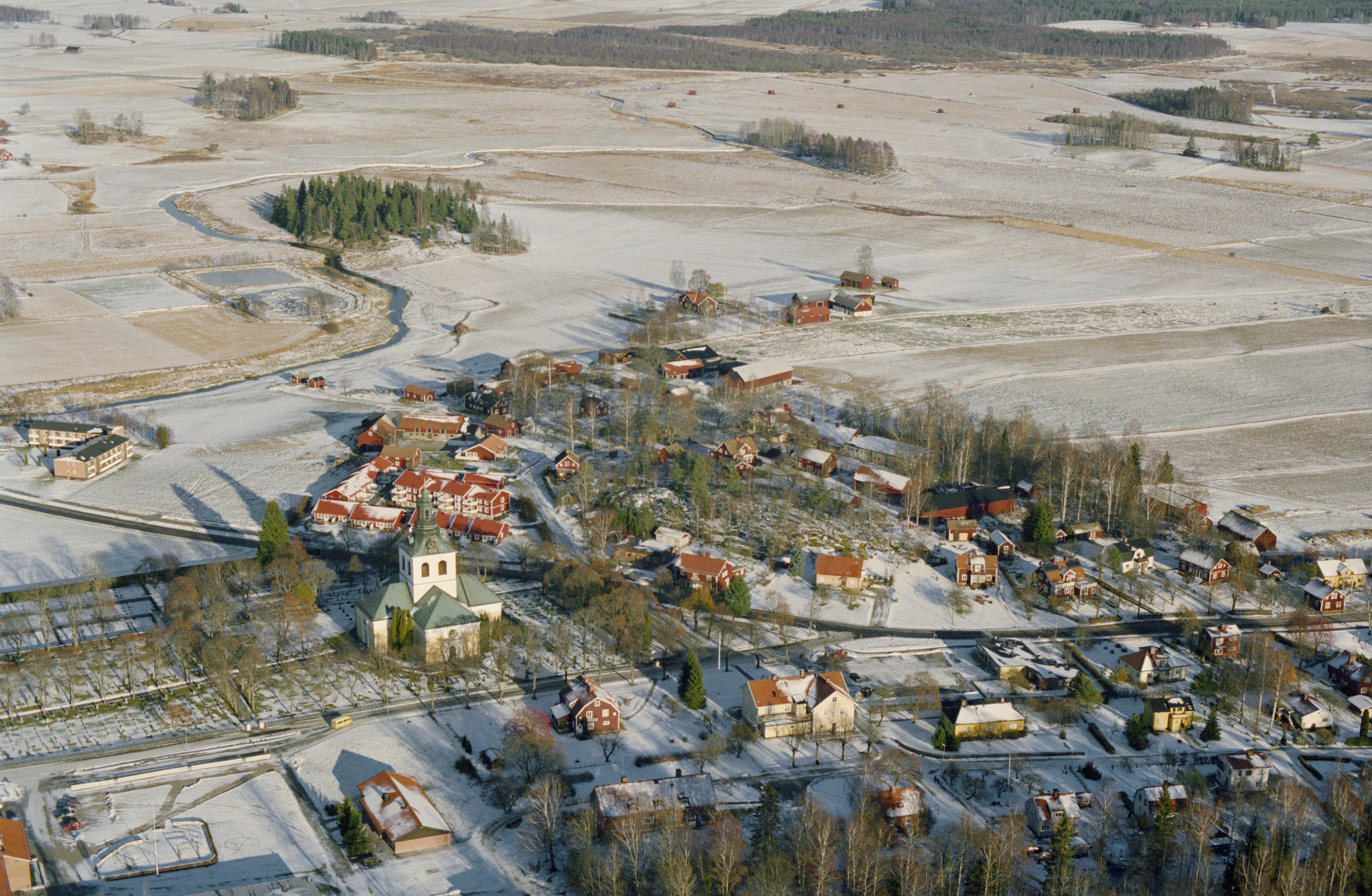 Beskrivning: Västerfärnebo kyrka och kyrkby i Svartåns dalgång. Vid kyrkan fyndplats (bl.a. flintgods) RAÄnr Västerfärnebo 588. Bilden är tagen mot (väderstreck): NO