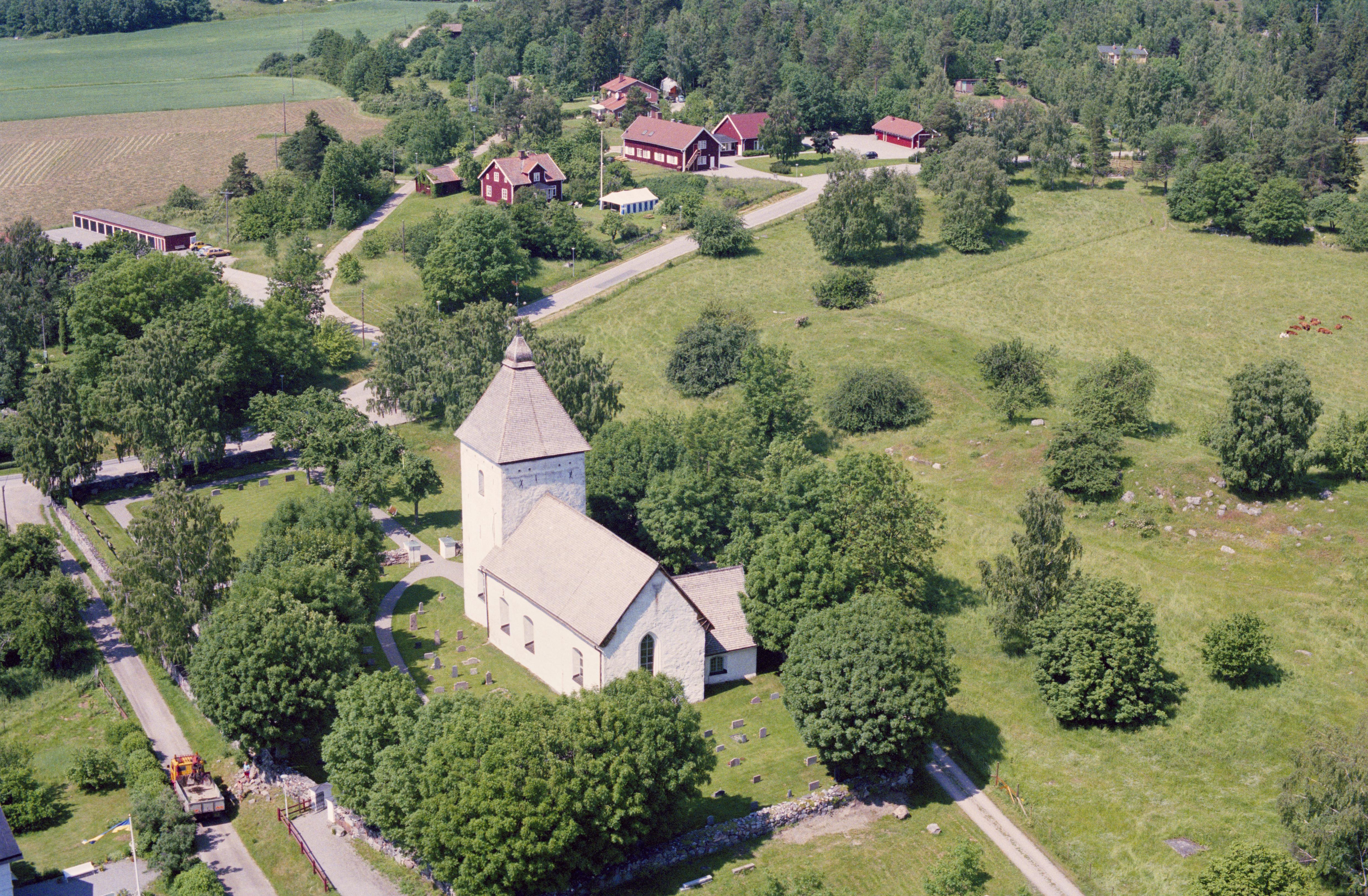 Beskrivning: Adelsö kyrka i fornlämningsområdet Hovgården RAÄnr Adelsö 46:2 på Adelsön vid Hovgårdsfjärden i Mälaren. Bilden är tagen mot (väderstreck): NV