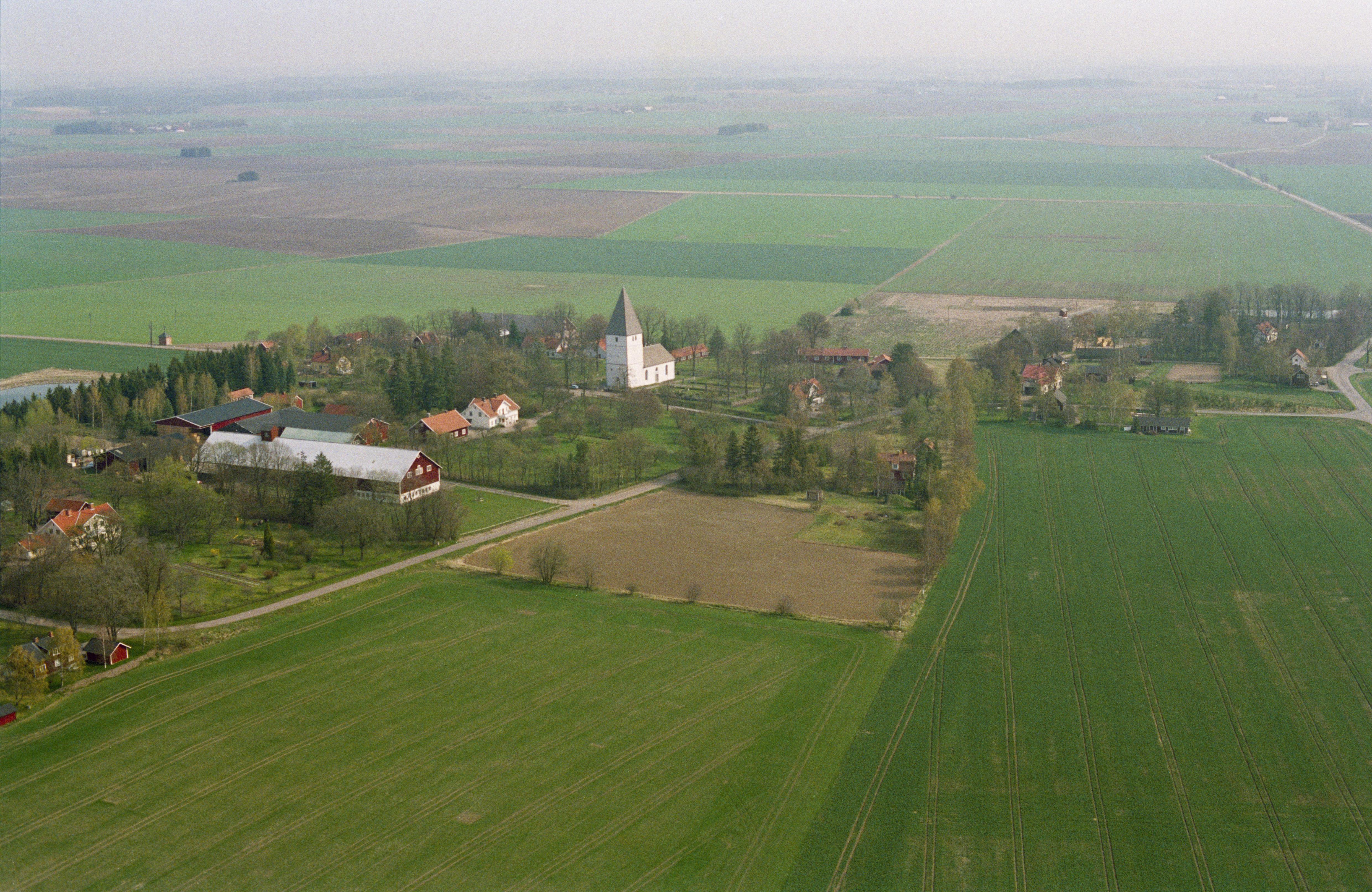 Beskrivning: Bjälbo kyrka och kyrkby. Bilden är tagen mot (väderstreck): NO