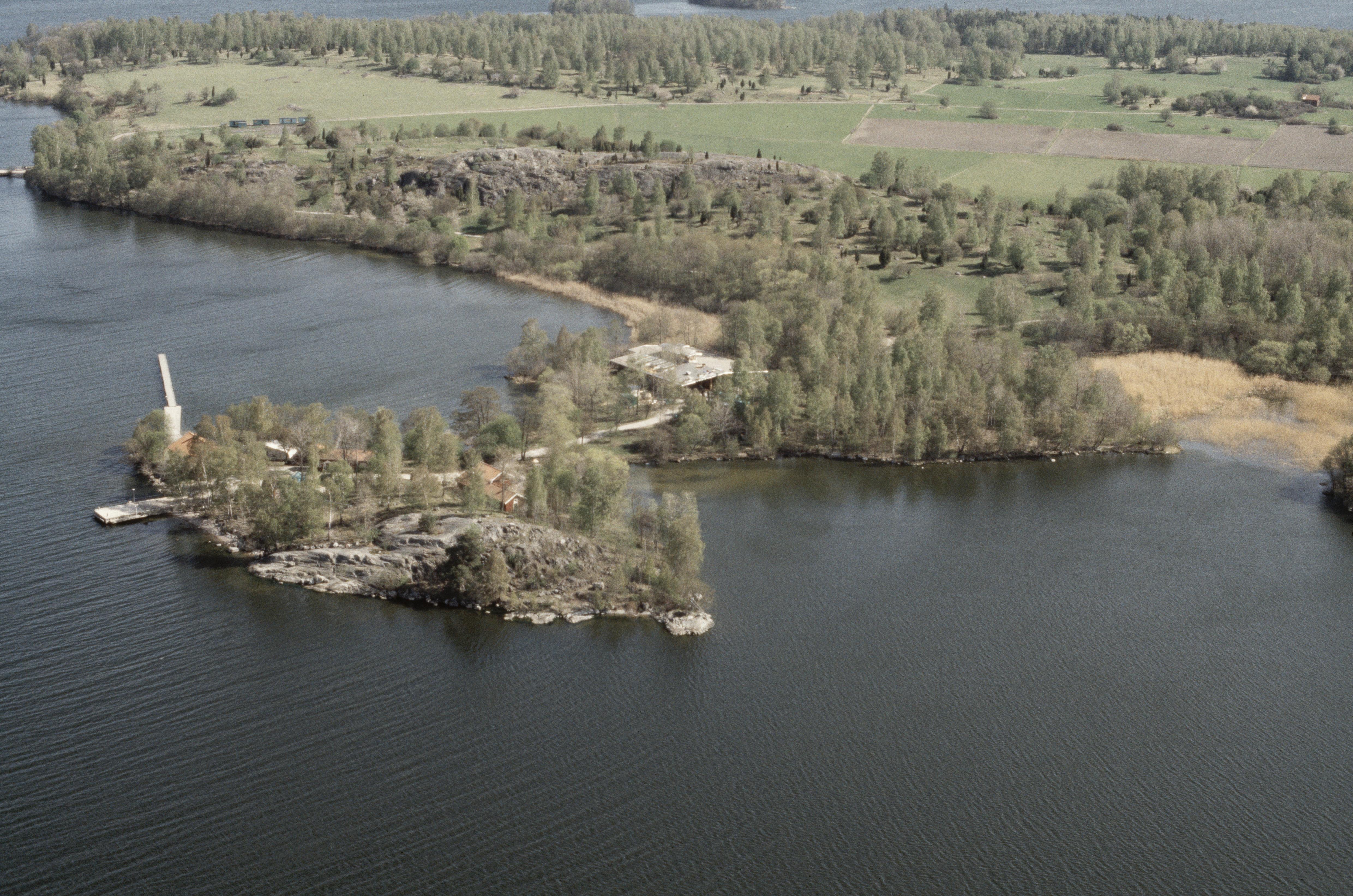 Beskrivning: Fornlämningsområdet Birka på Björkö i Mälaren. Ångholmen, Birka Museum, fornborg Borg RAÄnr Adelsö 34:1 och Ansgarsmonumentet m.fl. Bilden är tagen mot (väderstreck): NO