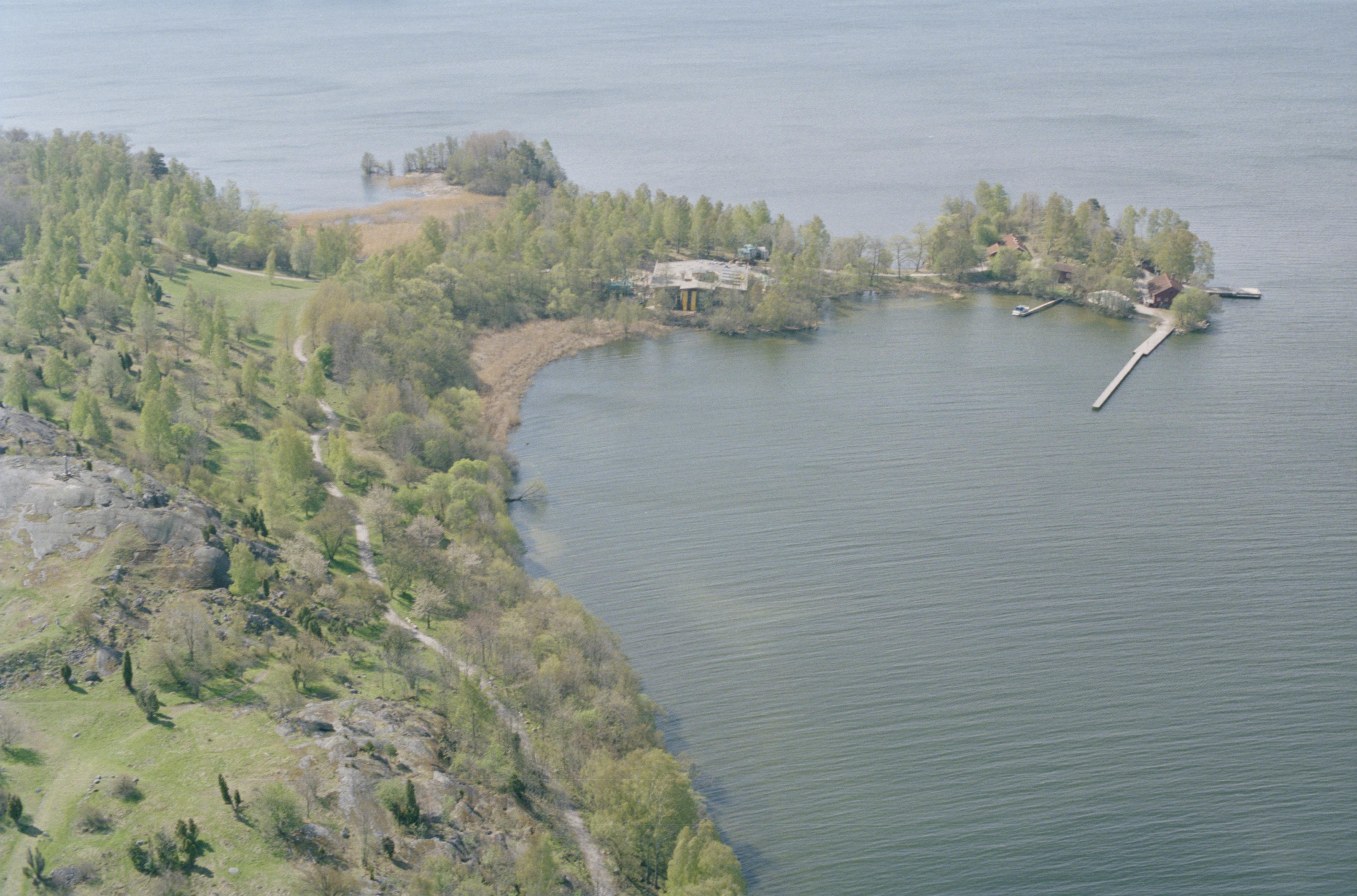 Beskrivning: Fornlämningsområdet Birka på Björkö i Mälaren. Vid bildens mitt Ångholmen, Birka Museum, fornborg Borg RAÄnr Adelsö 34:1 och Ansgarsmonumentet. Bilden är tagen mot (väderstreck): S