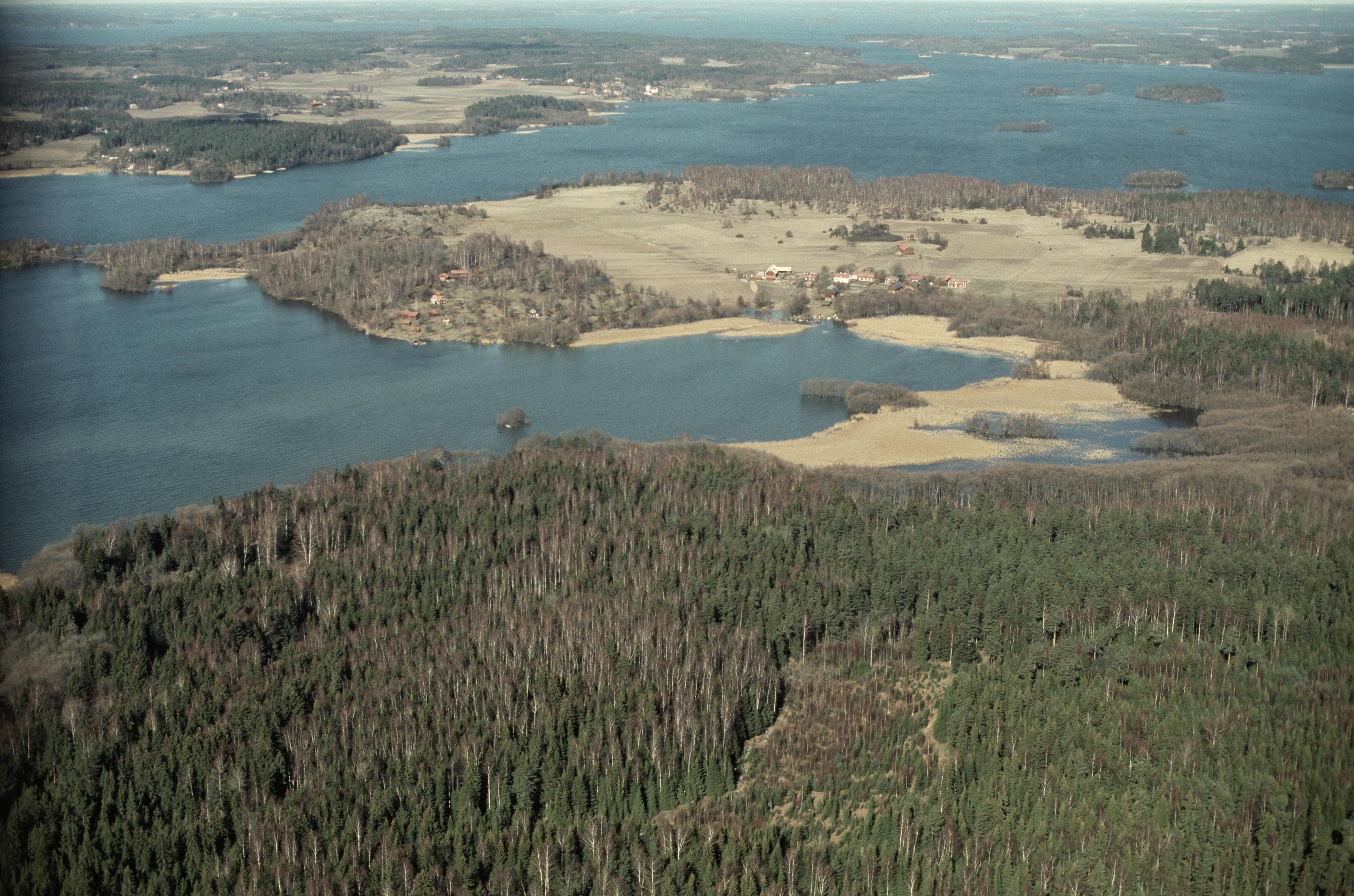 Beskrivning: Ön Björkö i Mälaren med fornlämningsområdet Birka. Vid bildens mitt fornborg Borg RAÄnr Adelsö 34:1, grav- och boplatsområden Hemlanden och Svarta jorden Adelsö 118:1 vid Stadsvallen Adelsö 119:1-2, Björkö by m.fl. Uppe till vänster Adelsön. Bilden är tagen mot (väderstreck): NV