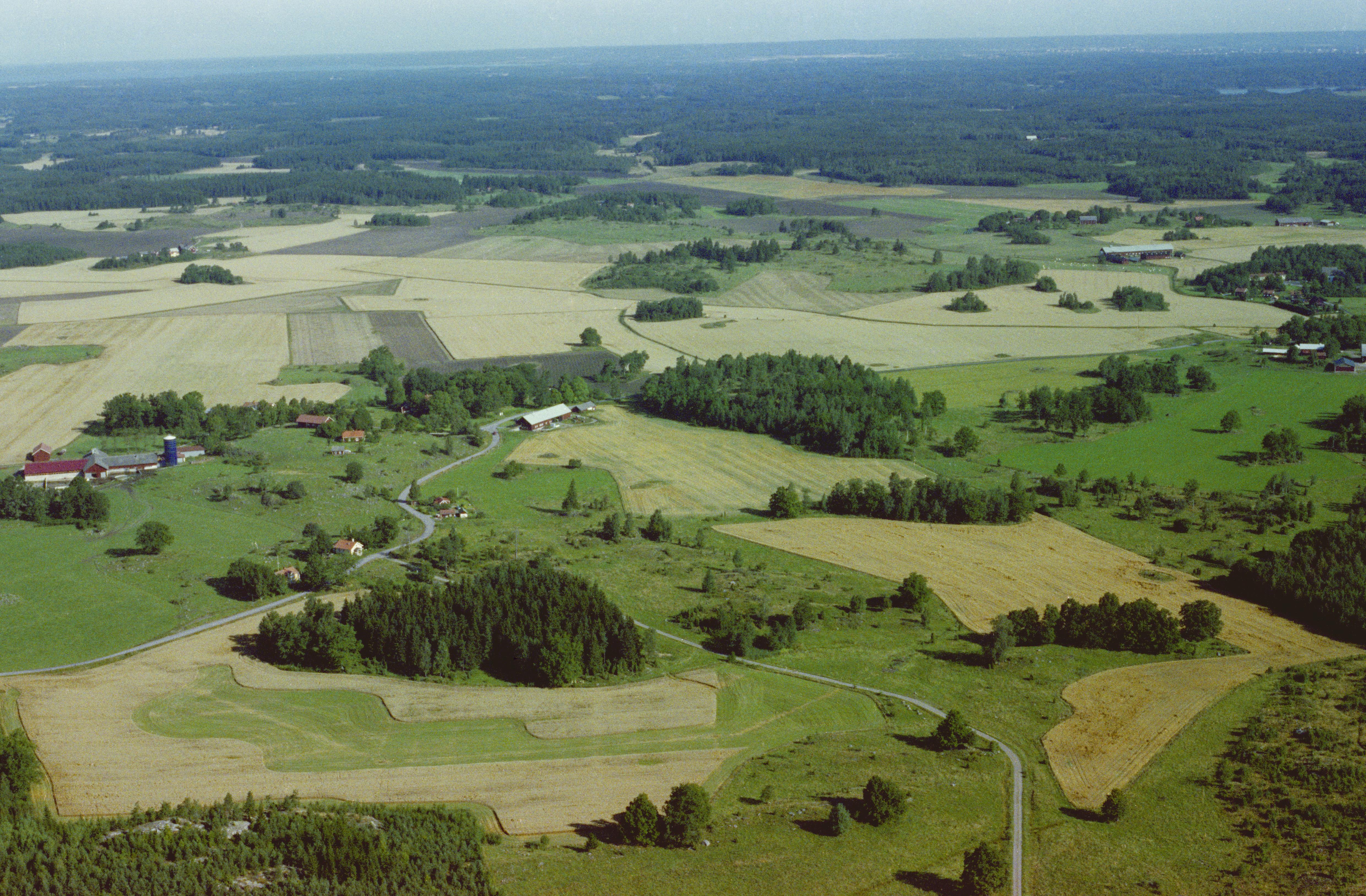 Beskrivning: Åkerby sydost om Gårdeby kyrkby. Prästgård och gravfält RAÄnr Gårdeby 14:1 vid bildens mitt. Gårdeby kyrkby i bildens övre del till höger. Bilden är tagen mot (väderstreck): NNV