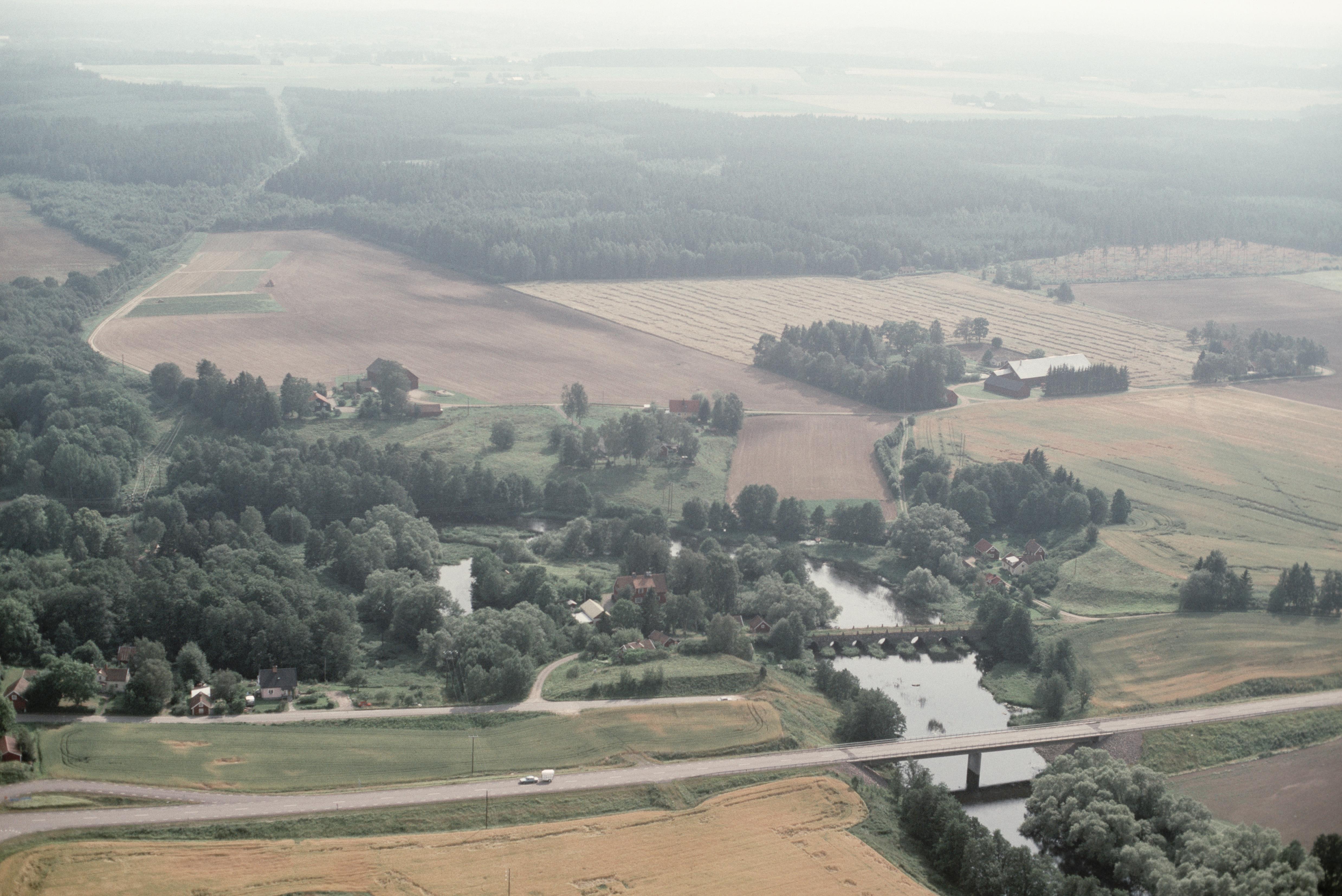 Beskrivning: Öjebro by. Broarna över Svartån. Stenvalvsbro RAÄnr Herrberga 1:1 till höger under bildens mitt. Bilden är tagen mot (väderstreck): S