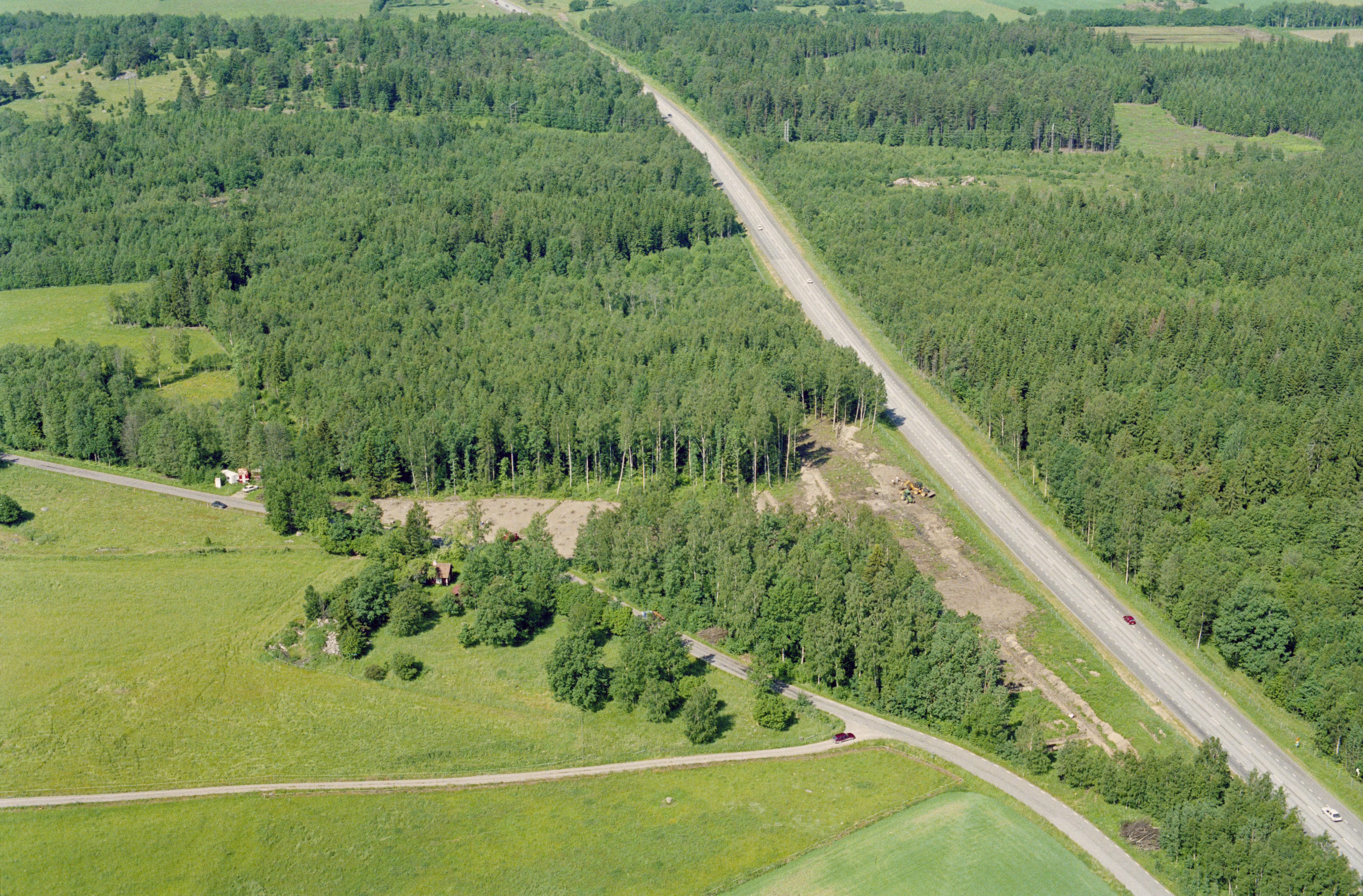 Beskrivning: Arkeologisk undersökning innan bygging av väg E4, vid gränsen mot socknen Hogstad (uppe till höger) och Väderstad (uppe till vänster). Vid bildens mitt hägnad RAÄnr Hogstad 166:1-2. Nere till höger stensättningar RAÄnr Rinna 18:1-3. Bilden är tagen mot (väderstreck): V