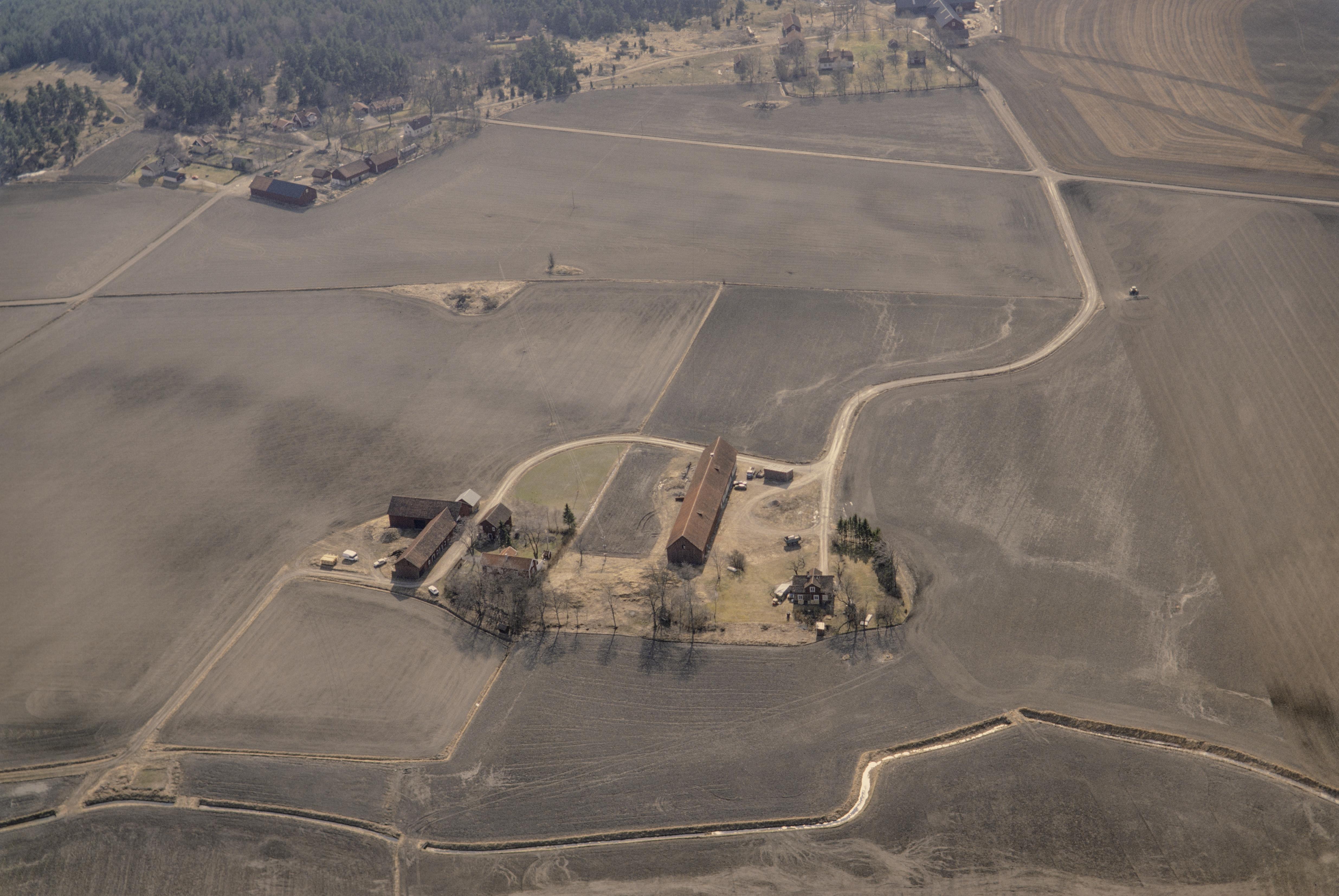 Beskrivning: Ån Samnan vid Myrby. Vid bildens nedre del bortodlat gravfält RAÄnr Danmark 149:1. I bildens övre del byarna Viggeby och Krisslinge. Bilden är tagen mot (väderstreck): SSV