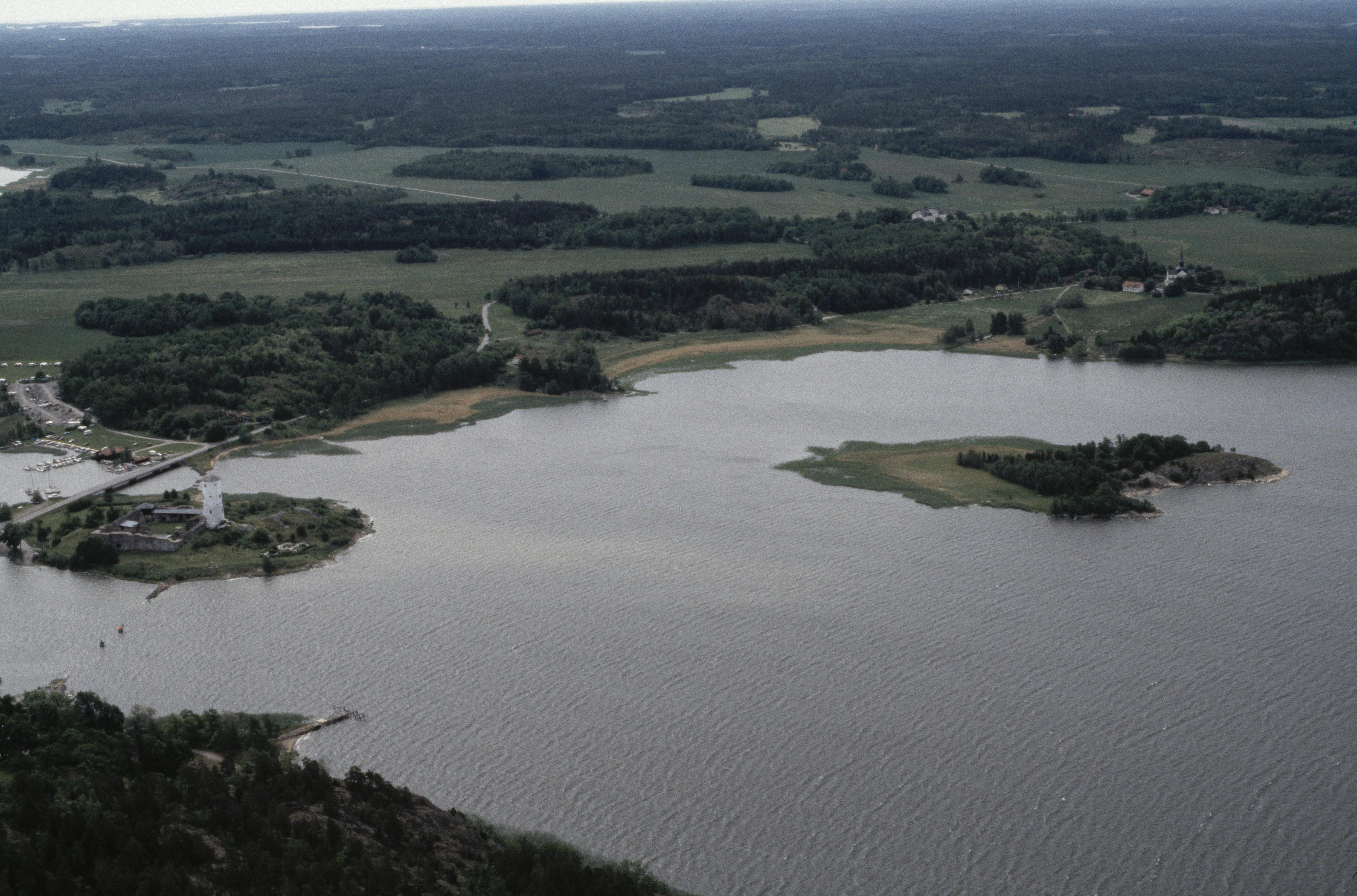 Beskrivning: Havsviken Slätbaken. Till vänster Stegeborgs slottsruin RAÄnr Skällvik 222:1, till höger Stegeborgs herrgård och Skällviks kyrka. Bilden är tagen mot (väderstreck): SSO