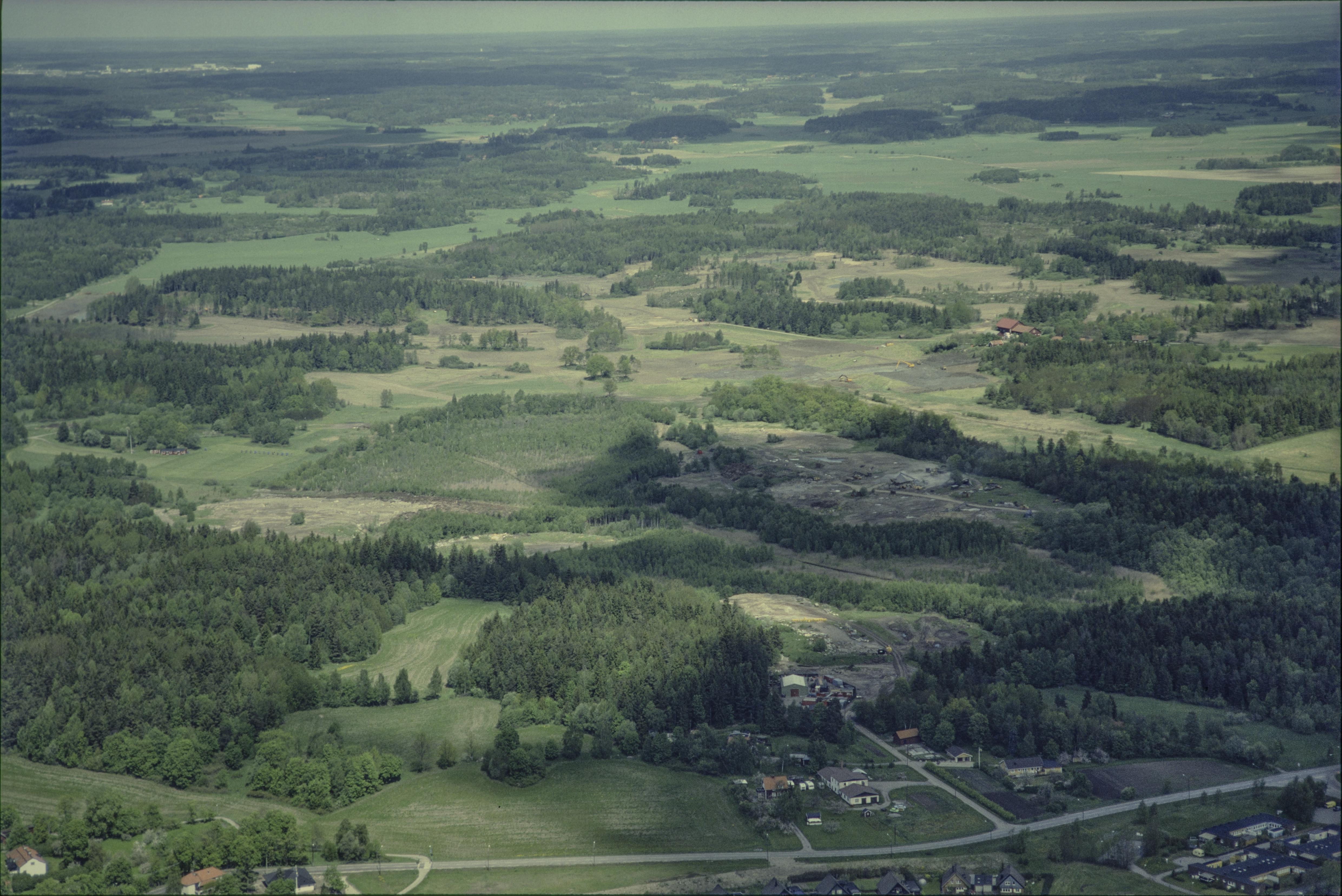Beskrivning: Nere till höger Fresta. Gravfält RAÄnr Fresta 41:1 nere till vänster. Vid bildens mitt grustäkt och Nibble golfbana i Hammarby socken. Bilden är tagen mot (väderstreck): NNO