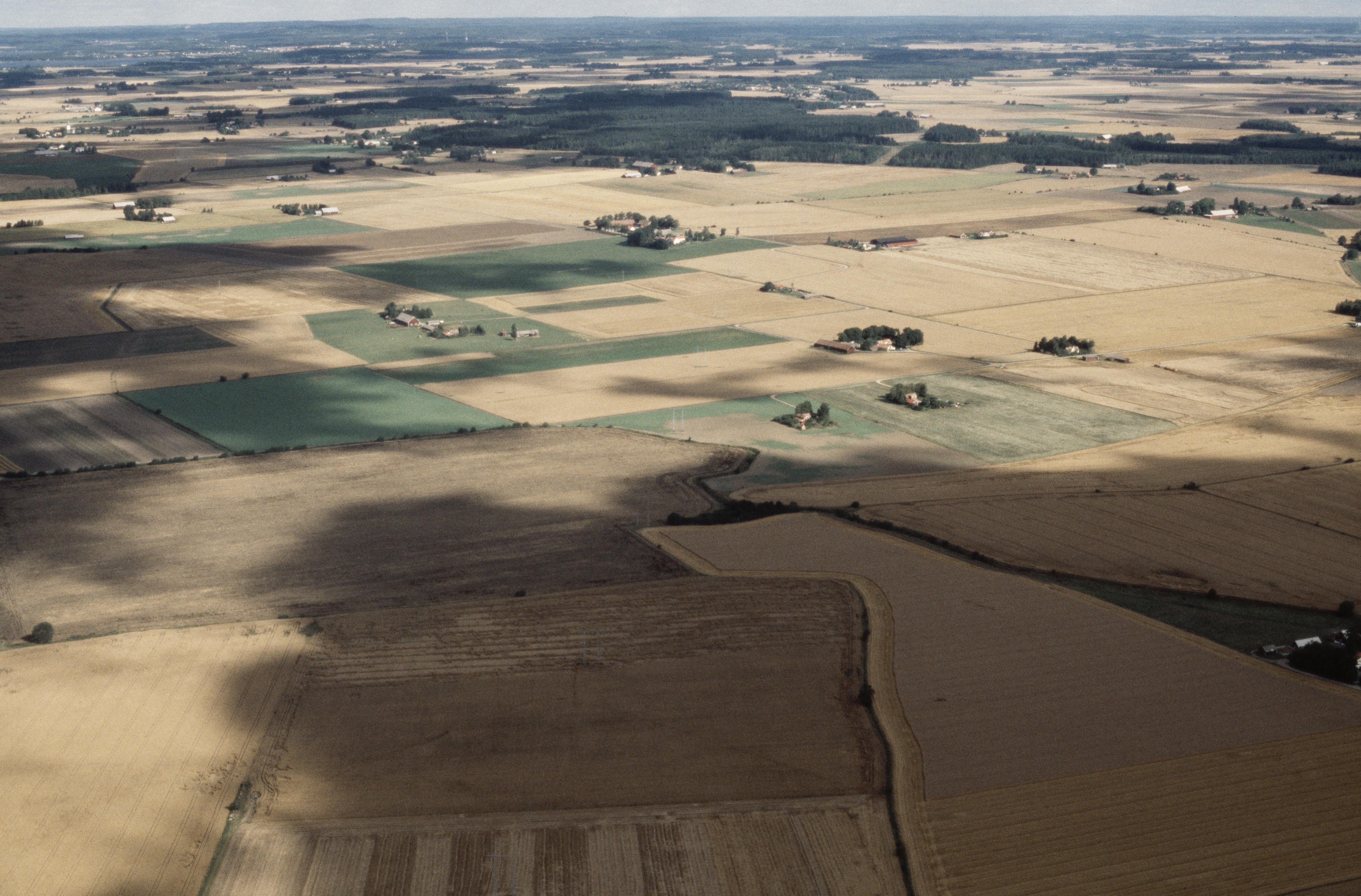 Beskrivning: Östgötaslätten vid gränsen mellan socknen Orlunda (till vänster), Bjälbo (nere till höger) och Allhelgona. Vid bildens mitt gårdarna Höglid, Lagmansberga och Brunnsgården m.fl. Byggnad Höglid RAÄnr Allhelgona 22:1 över bildens mitt. I bildens övre del socknet Fivelstad med Fivelstads kyrka uppe till vänster. Bilden är tagen mot (väderstreck): NNO