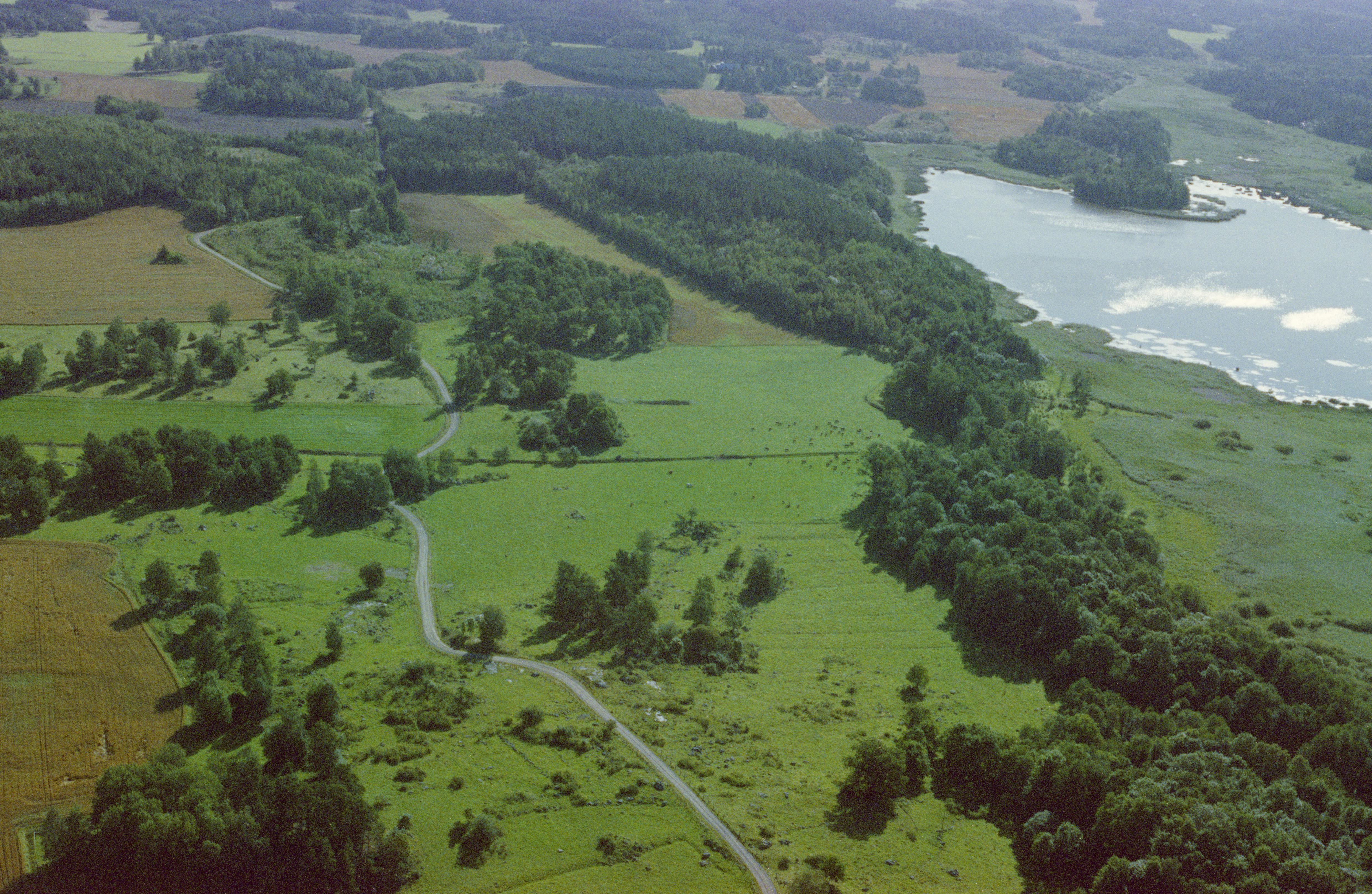 Beskrivning: Halleby gamla tomt RAÄnr Skärkind 122:1 vid Hallebysjön. Till vänster hägnadssystem RAÄnr Skärkind 285:1 m.fl. Bilden är tagen mot (väderstreck): Ö