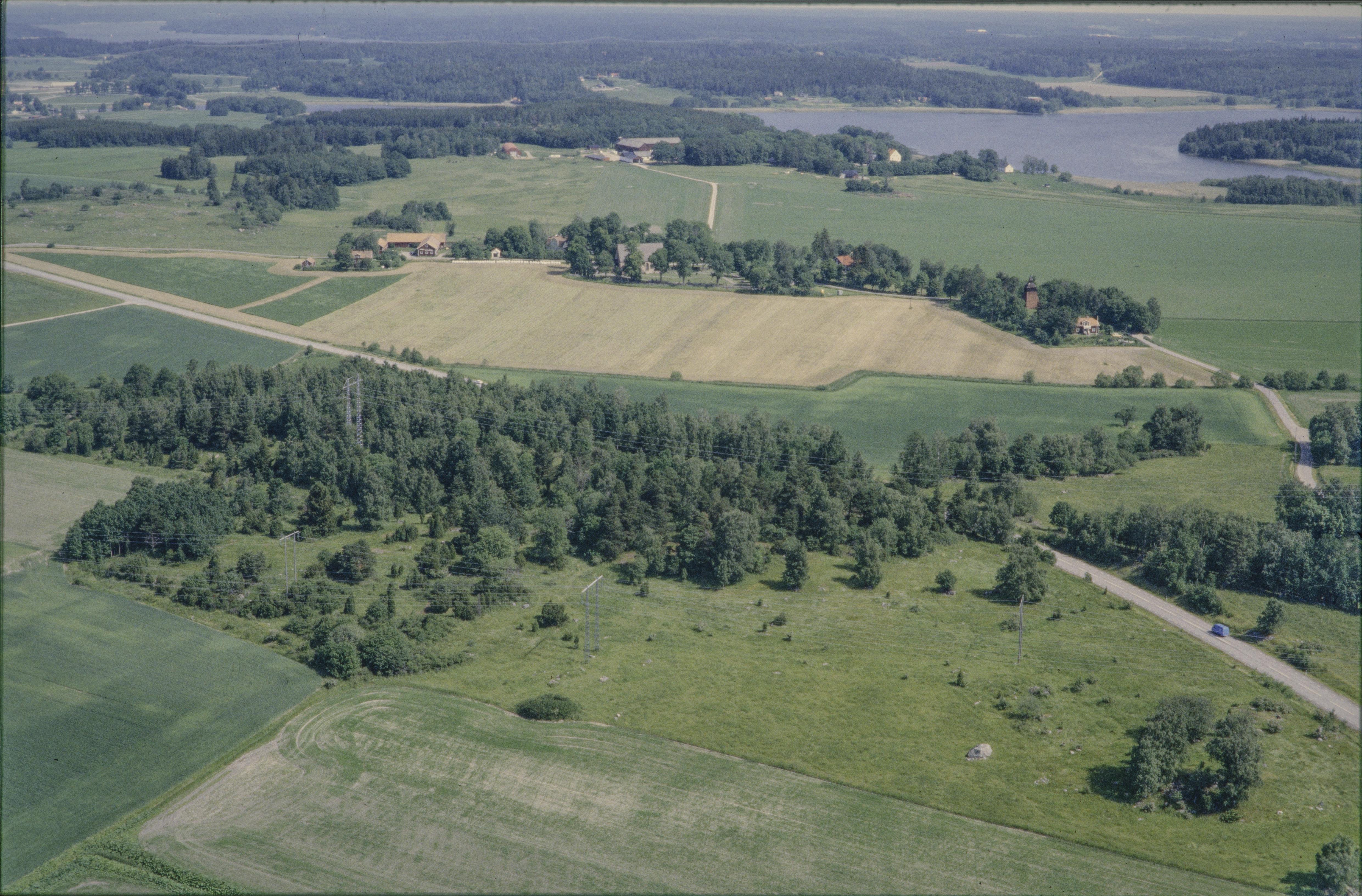 Beskrivning: Gravfält och runristning RAÄnr Håtuna 67:1-2 vid bildens mitt. I bildens övre del Håtunaholms herrgård / Håtuna säteri RAÄnr Håtuna 158:1 vid Håtunaviken i Mälaren. Bilden är tagen mot (väderstreck): NO