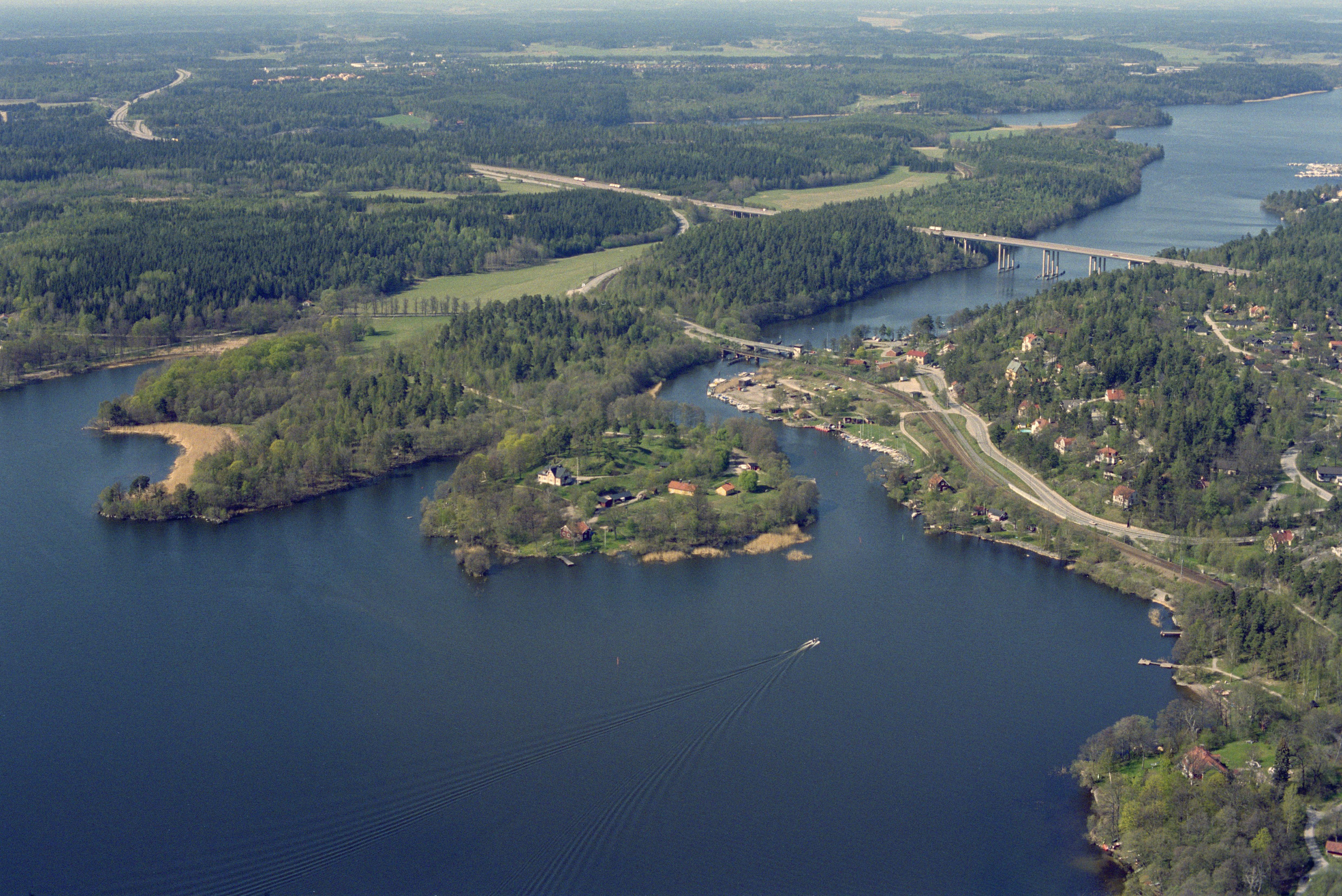 Beskrivning: Görväln i Mälaren. Stäketsön, Stäketsholmen med borgruin Sankt Eriks borg RAÄnr Kungsängen 73:1 och gränsen till Järfälla socken (tätorten Stäket till höger). Bilden är tagen mot (väderstreck): NNV