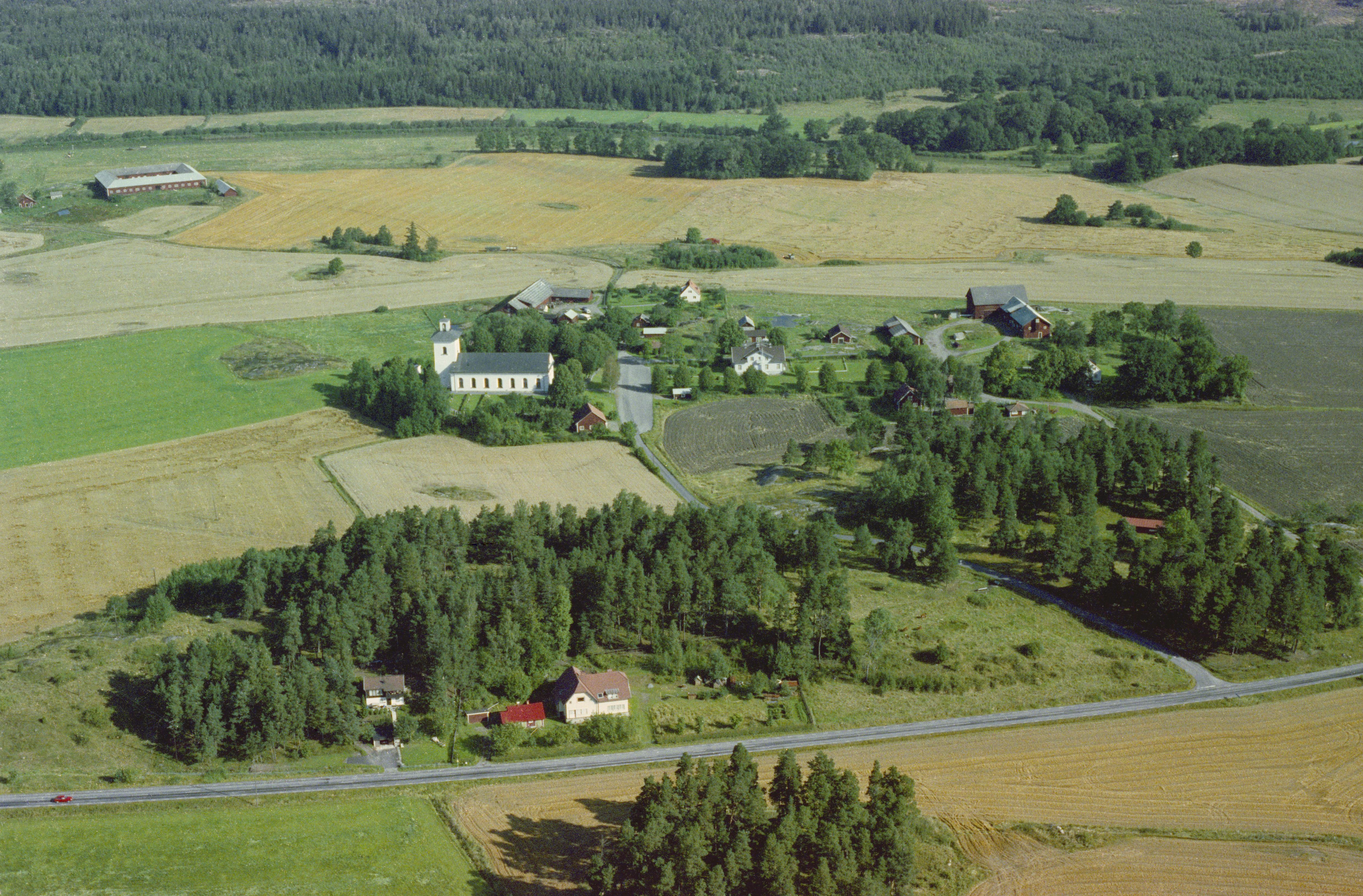 Beskrivning: Västra Husby kyrka. Gravfält RAÄnr Västra Husby 6:1 i bildens nedre del. Bilden är tagen mot (väderstreck): N