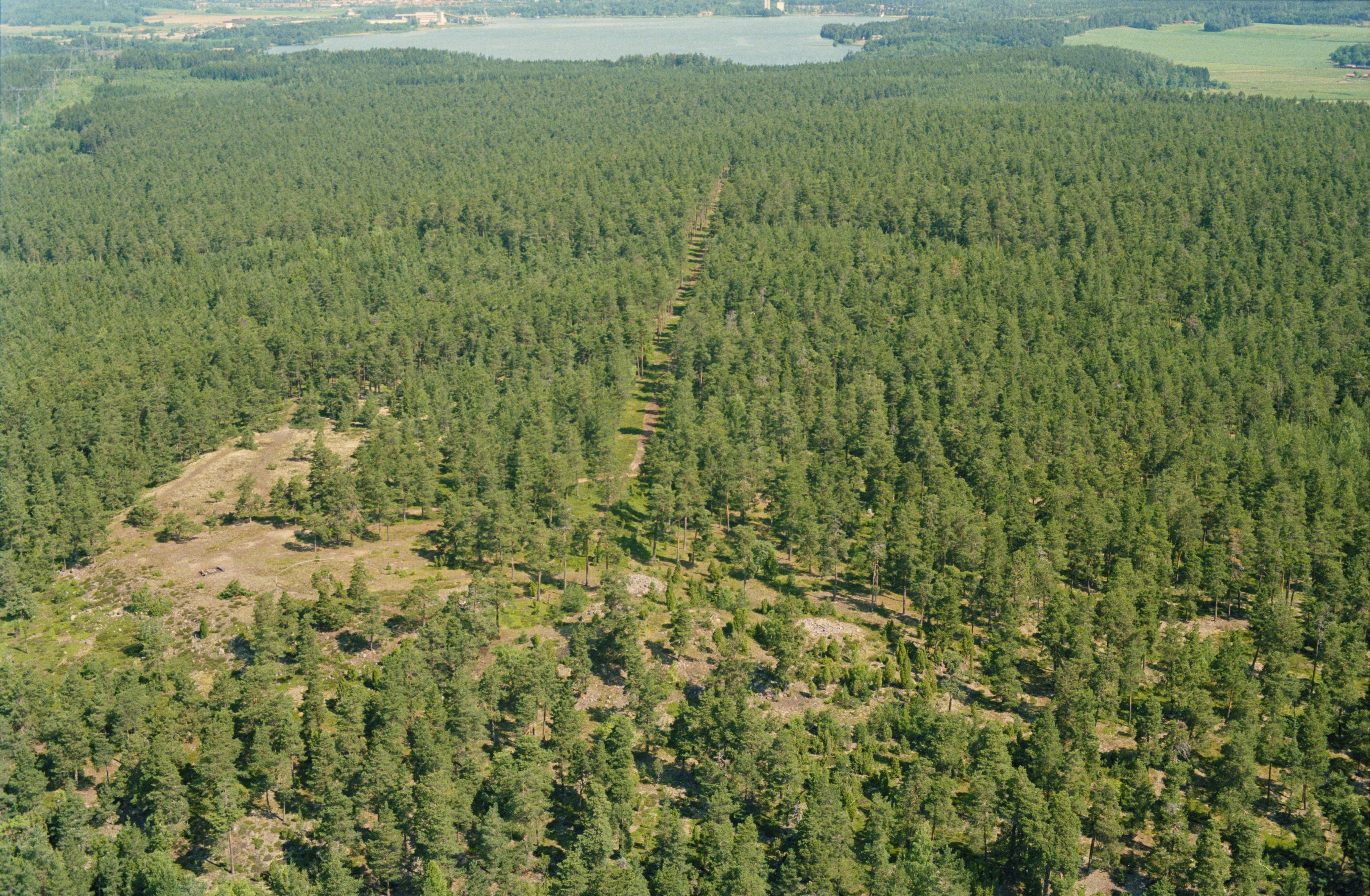 Beskrivning: Rösaringsåsen. Nere till vänster labyrint RAÄnr Låssa 24:1 och till höger gravfält Låssa 23:1. I bildens övre del färdväg (Rösarings processionsväg) RAÄnr Låssa 85:1 mot Kalmarviken i Mälaren. Bilden är tagen mot (väderstreck): N