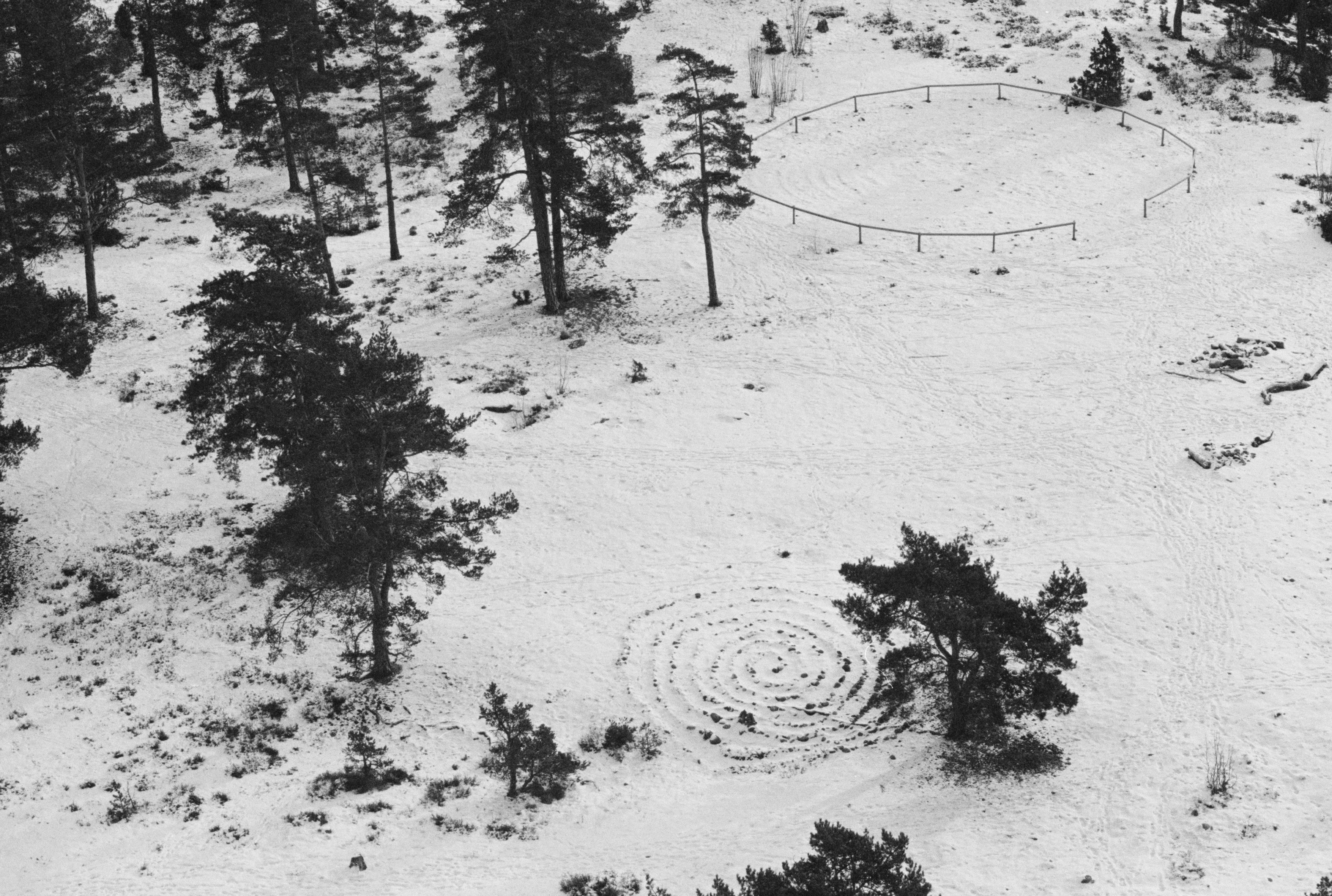 Beskrivning: Rösaringsåsen. Under bildens mitt en sentida, ny labyrint. Uppe till höger labyrint RAÄnr Låssa 24:1 vid gravfält Låssa 23:1. I bildens övre del södra änden av färdväg (Rösarings processionsväg) RAÄnr Låssa 85:1. Bilden är tagen mot (väderstreck): NO