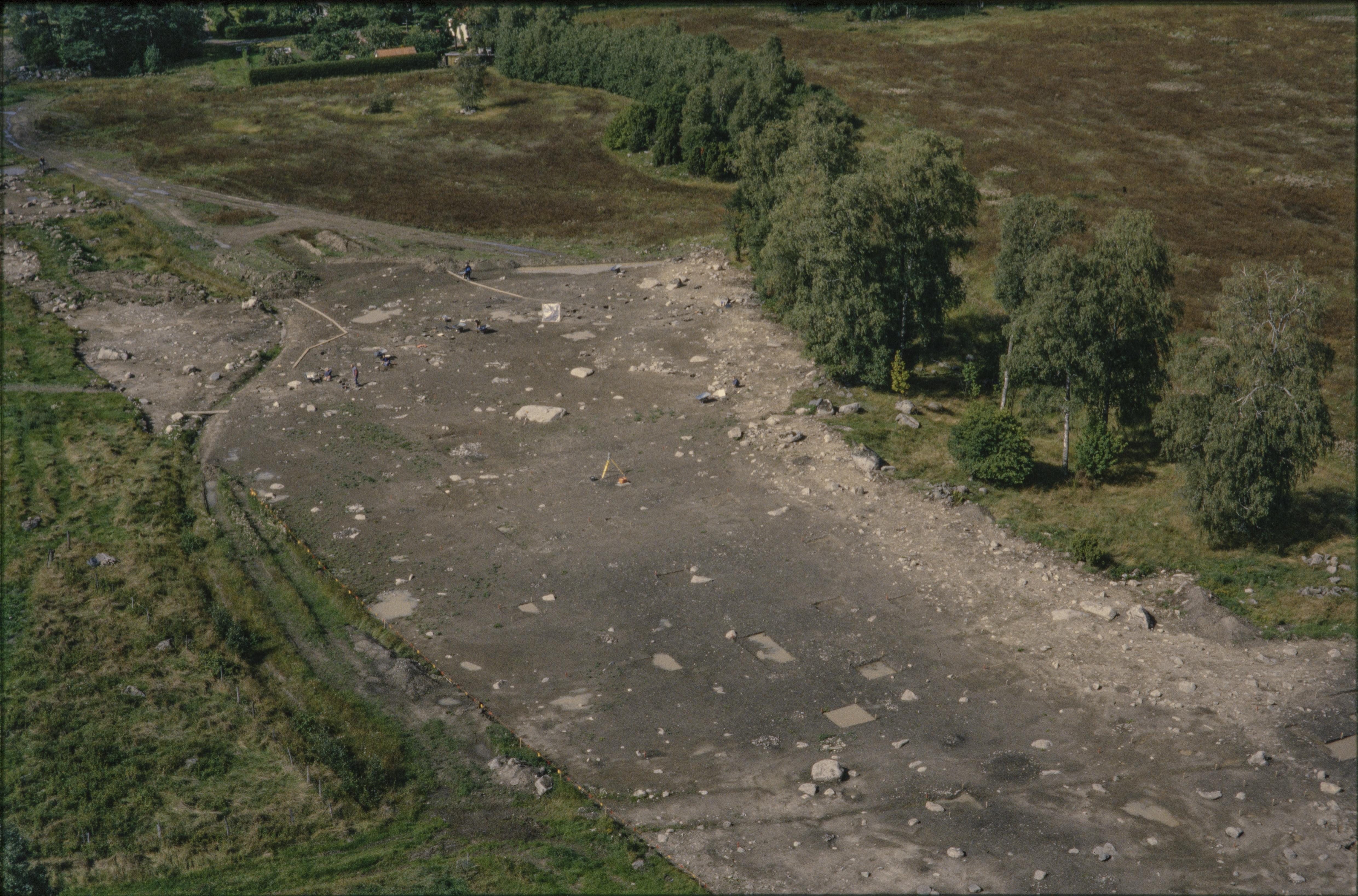 Beskrivning: Rickebyåns dalgång vid Åslunda by innan bygge av järnväg (Arlandabanan) sydost om Svartsjön. Längs bildens mitt bo- och gravplats RAÄnr Odensala 6:1, 402:1-2, 11:1, och 13:1, boplats Odensala 489:1, m.fl. Bilden är tagen mot (väderstreck): NV