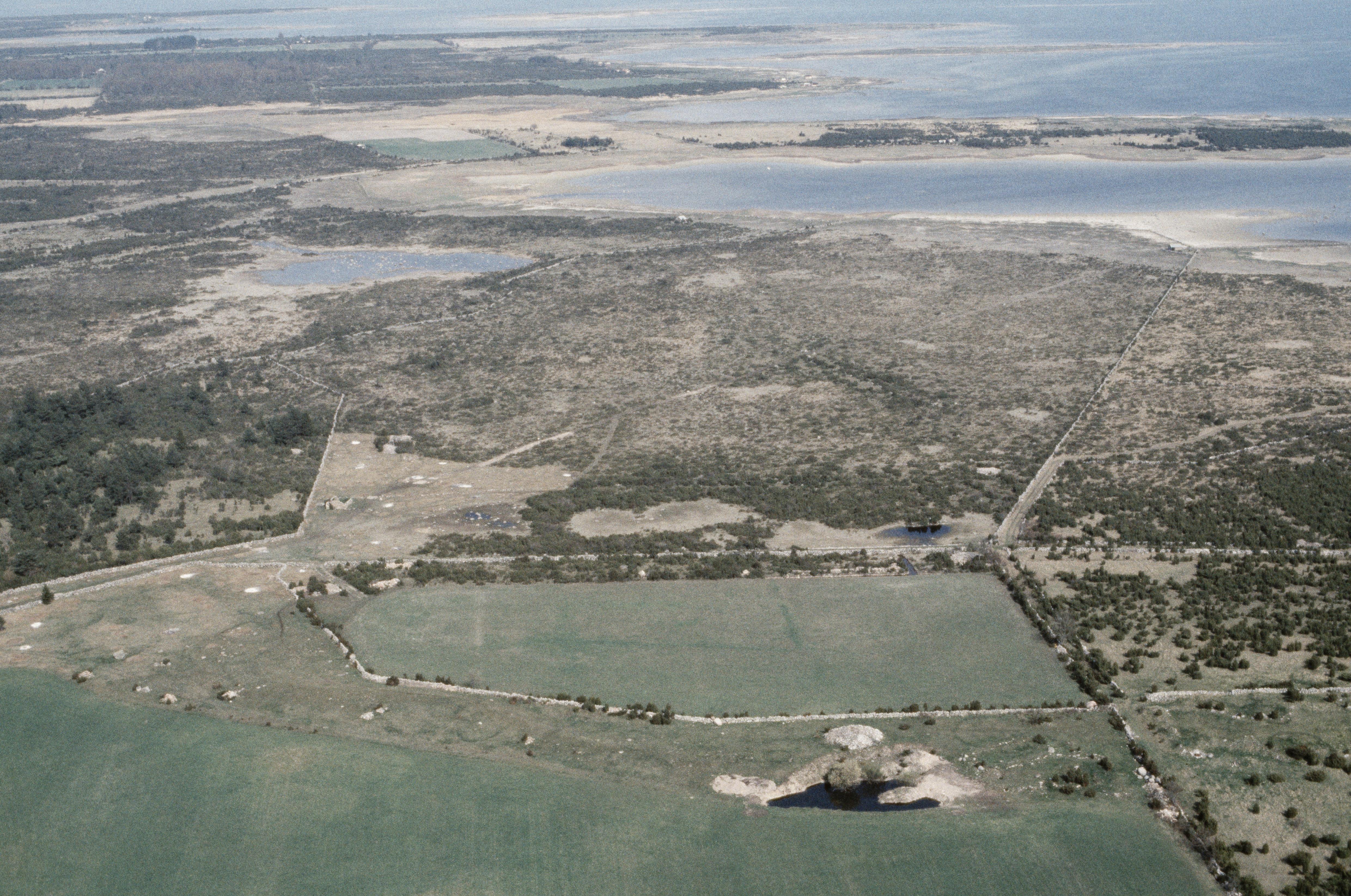Beskrivning: Trullbjärg norrost om Djurstad. Boplats RAÄnr RAÄnr Föra 4:1, hägnader Föra 10:3 m.fl. Uppe till vänster Södra Greda, till höger Lilla Fjärden och näset Lillholm. Bilden är tagen mot (väderstreck): NO