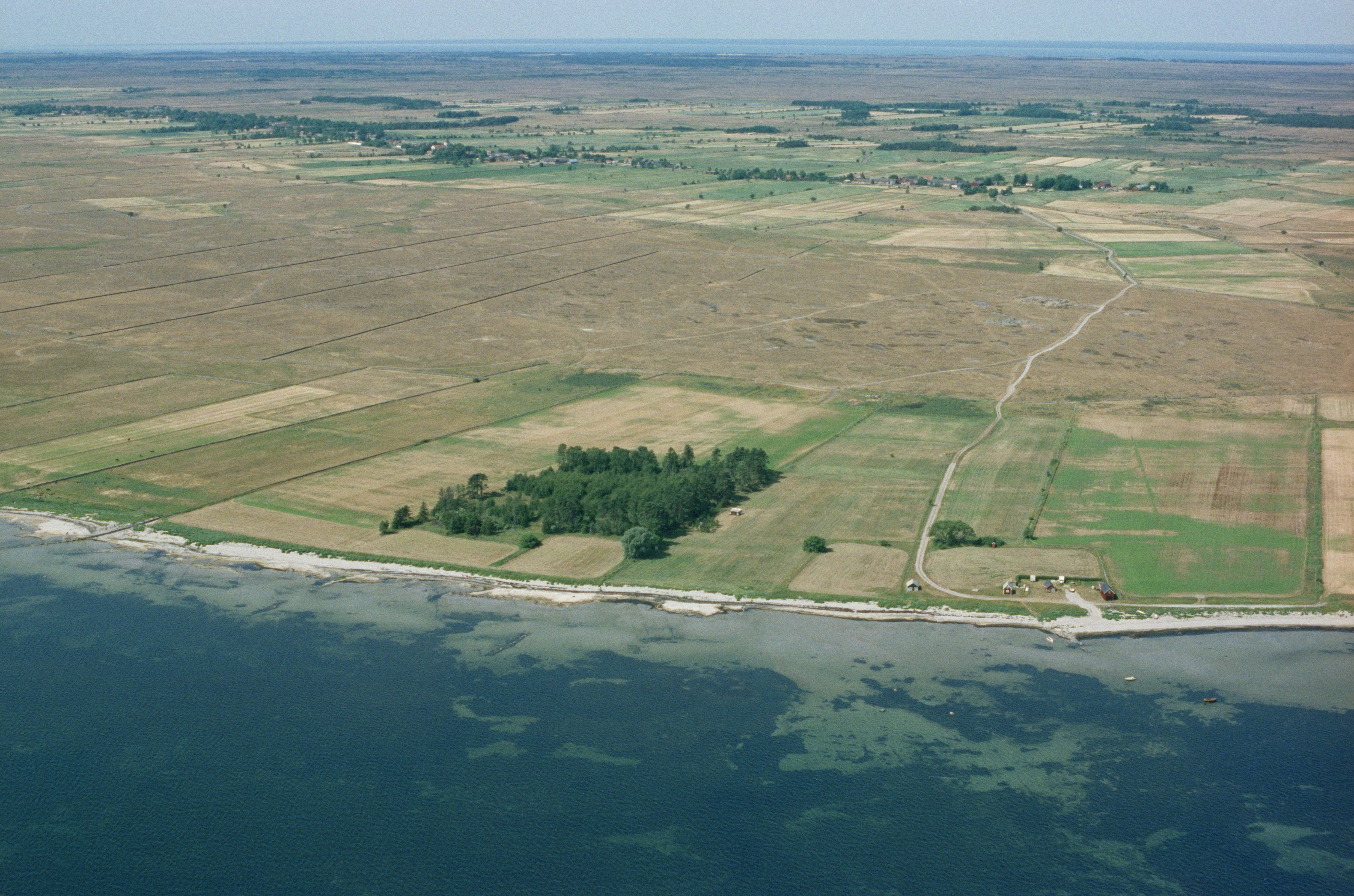 Beskrivning: Strandängar på öster om Stora Brunneby. Vid bildens mitt stensättning RAÄnr Stenåsa 61:2 och hällristning Stenåsa 128:1. Bilden är tagen mot (väderstreck): VSV