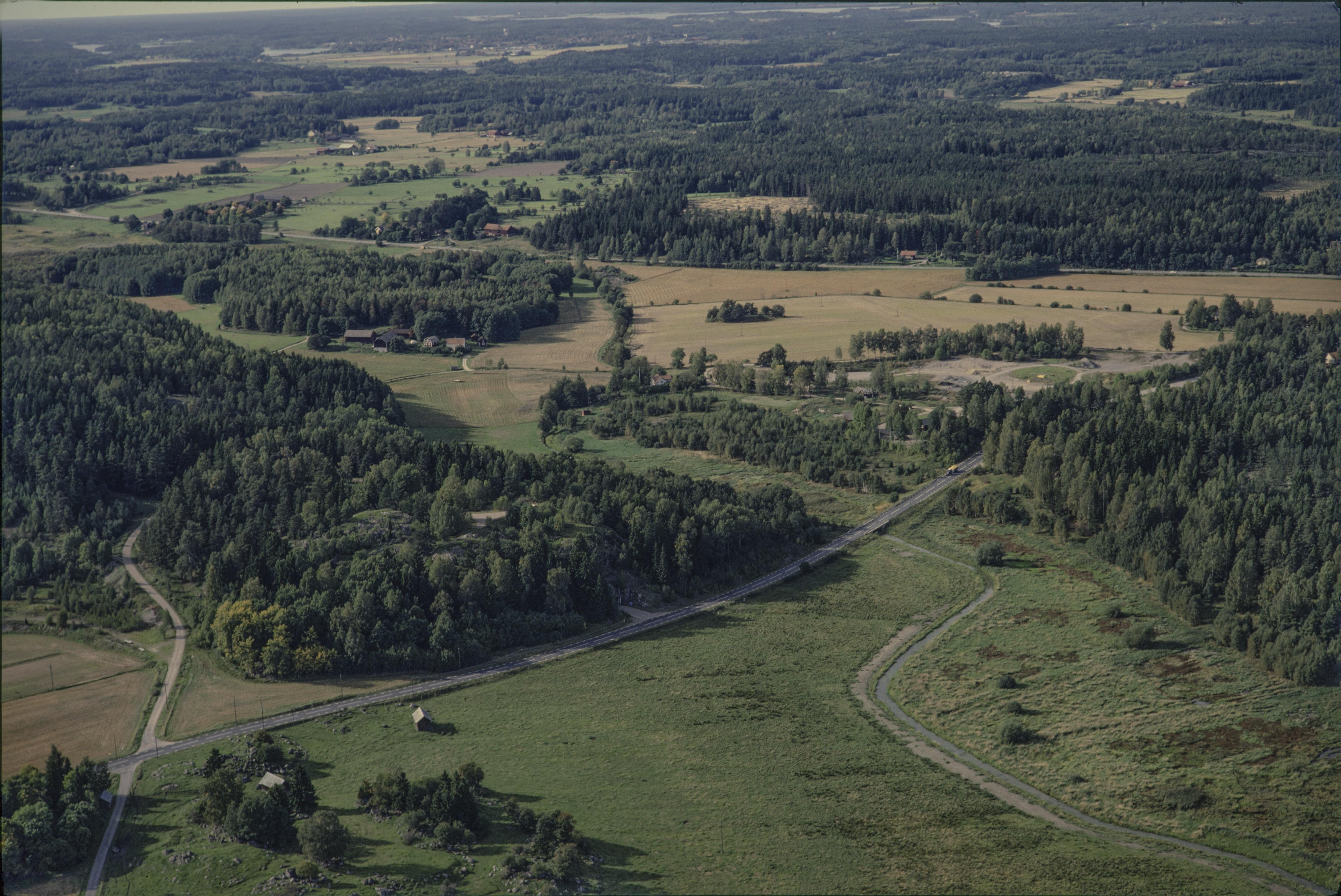 Beskrivning: Vid bildens mitt Hamnbrinkens fornborg RAÄnr Skederid 16:1 och gravfält Skederid 17:1 vid Vretaån i Darsgärde by. Bilden är tagen mot (väderstreck): VNV