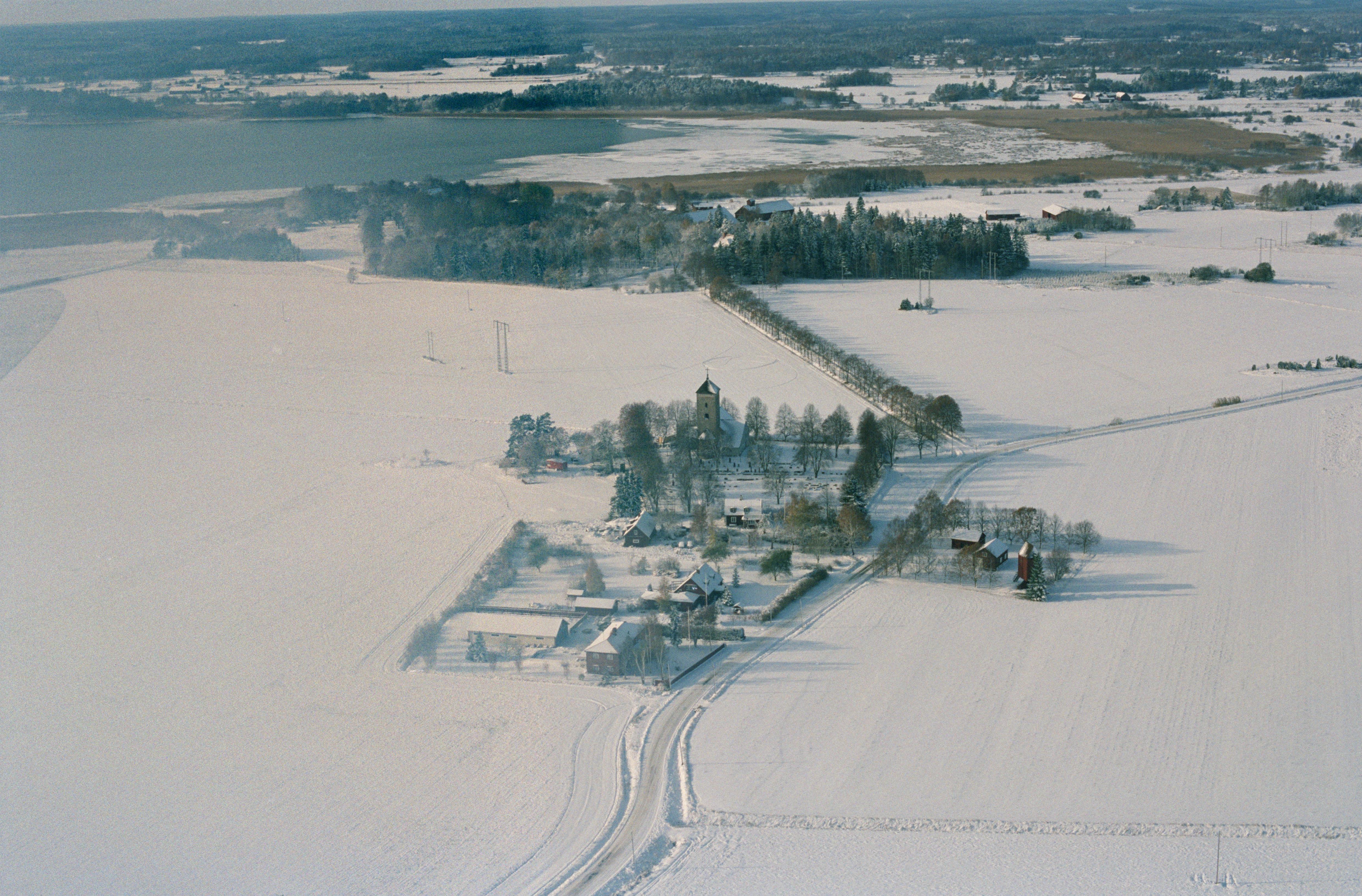 Beskrivning: Skånela kyrka, Klockaregård och hembygdsmuseum. I bildens övre del Skånelaholms slott vid sjön Fysingen. Bilden är tagen mot (väderstreck): VSV