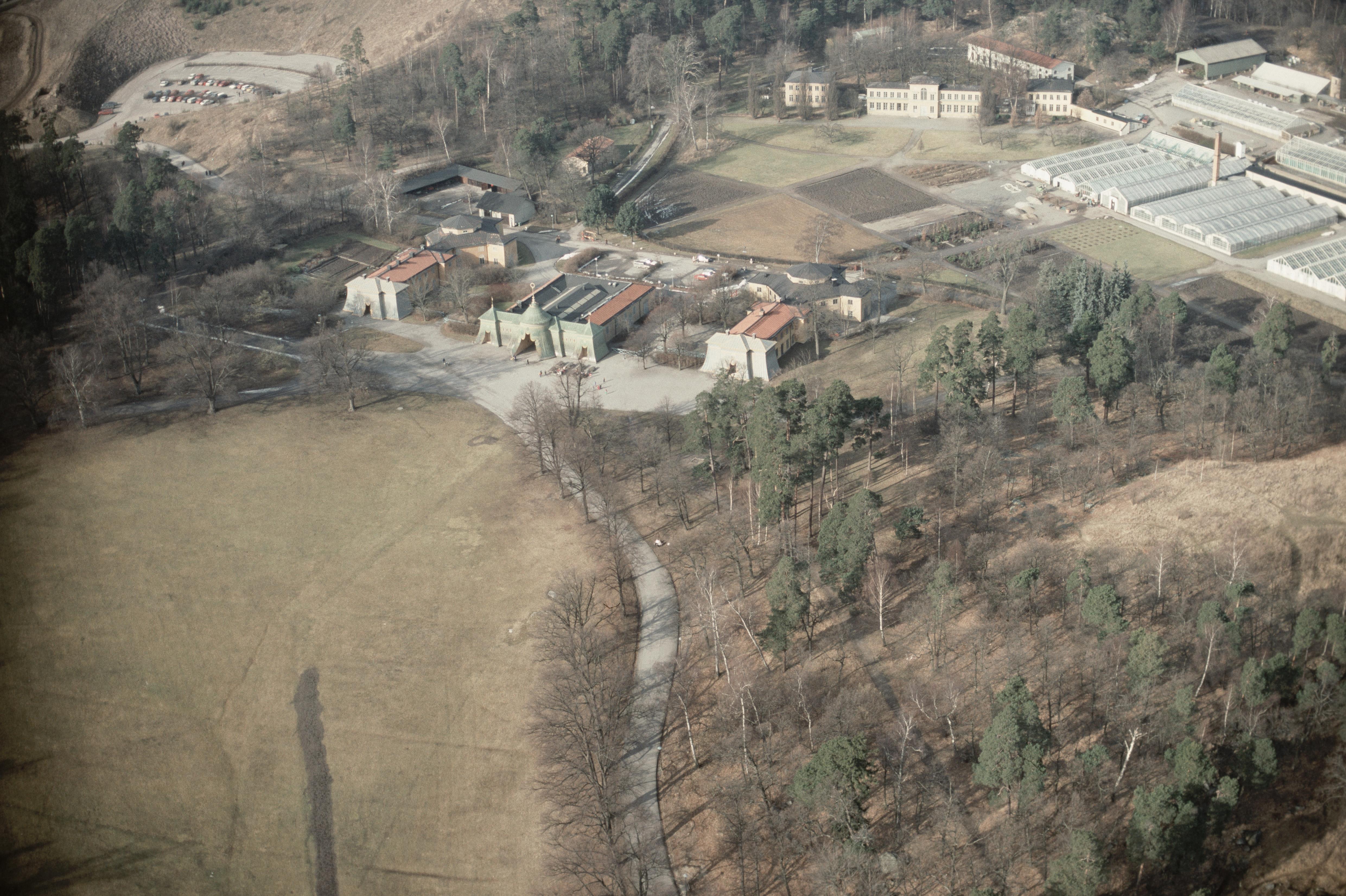 Beskrivning: Koppartälten vid Haga slott byggnadsminne RAÄnr Solna 30:1-3 i Hagaparken. I bildens övre del Fjärilshuset i Haga trädgård. Bilden är tagen mot (väderstreck): NV