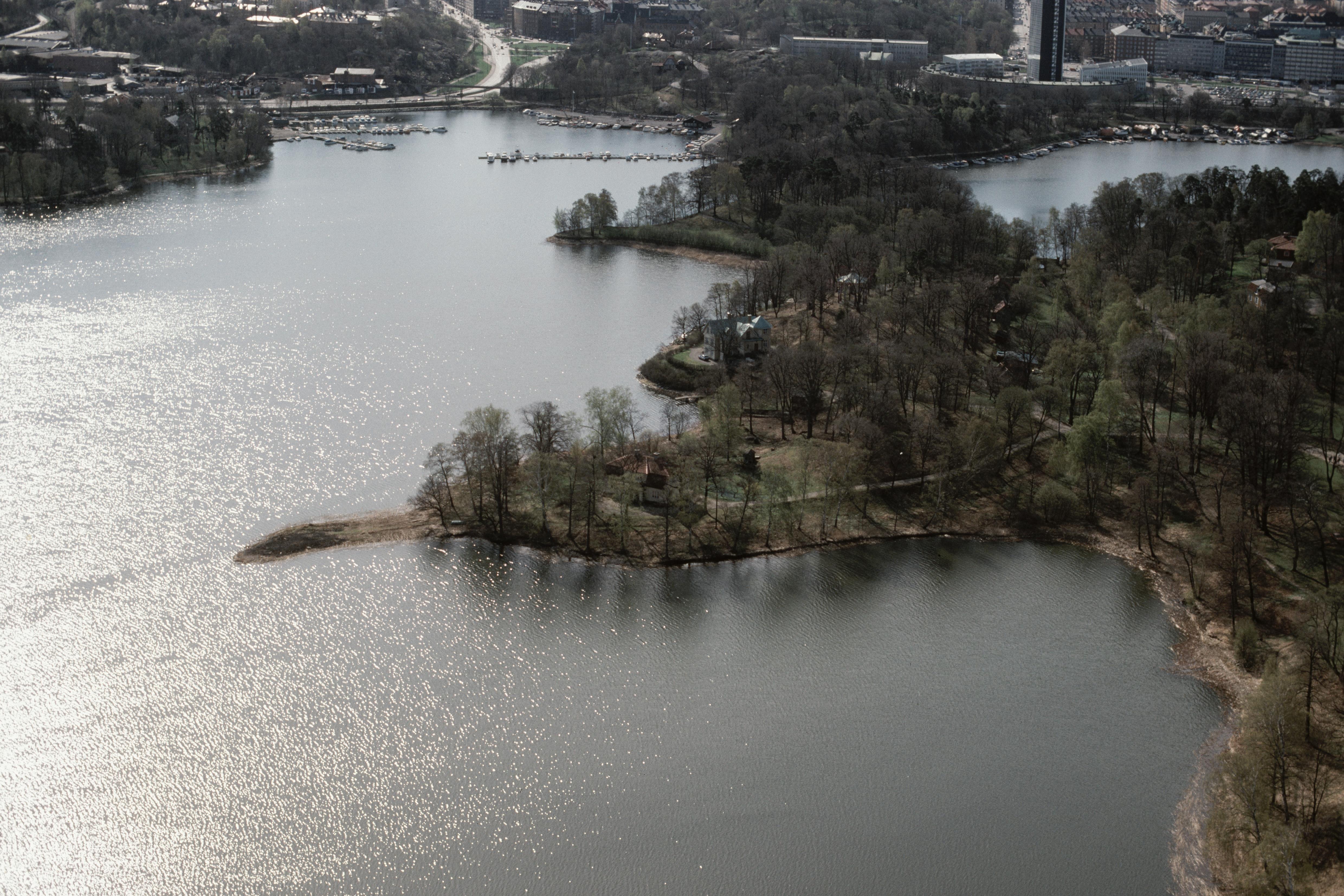 Beskrivning: Gamla Haga RAÄnr Solna 30:1-3 i Hagaparken vid Brunnsviken. Villa Ädelsten och Villa Valhalla m.fl. I bildens övre del Vasastaden och Wenner-Gren Center i Stockholms innerstad. Bilden är tagen mot (väderstreck): SO