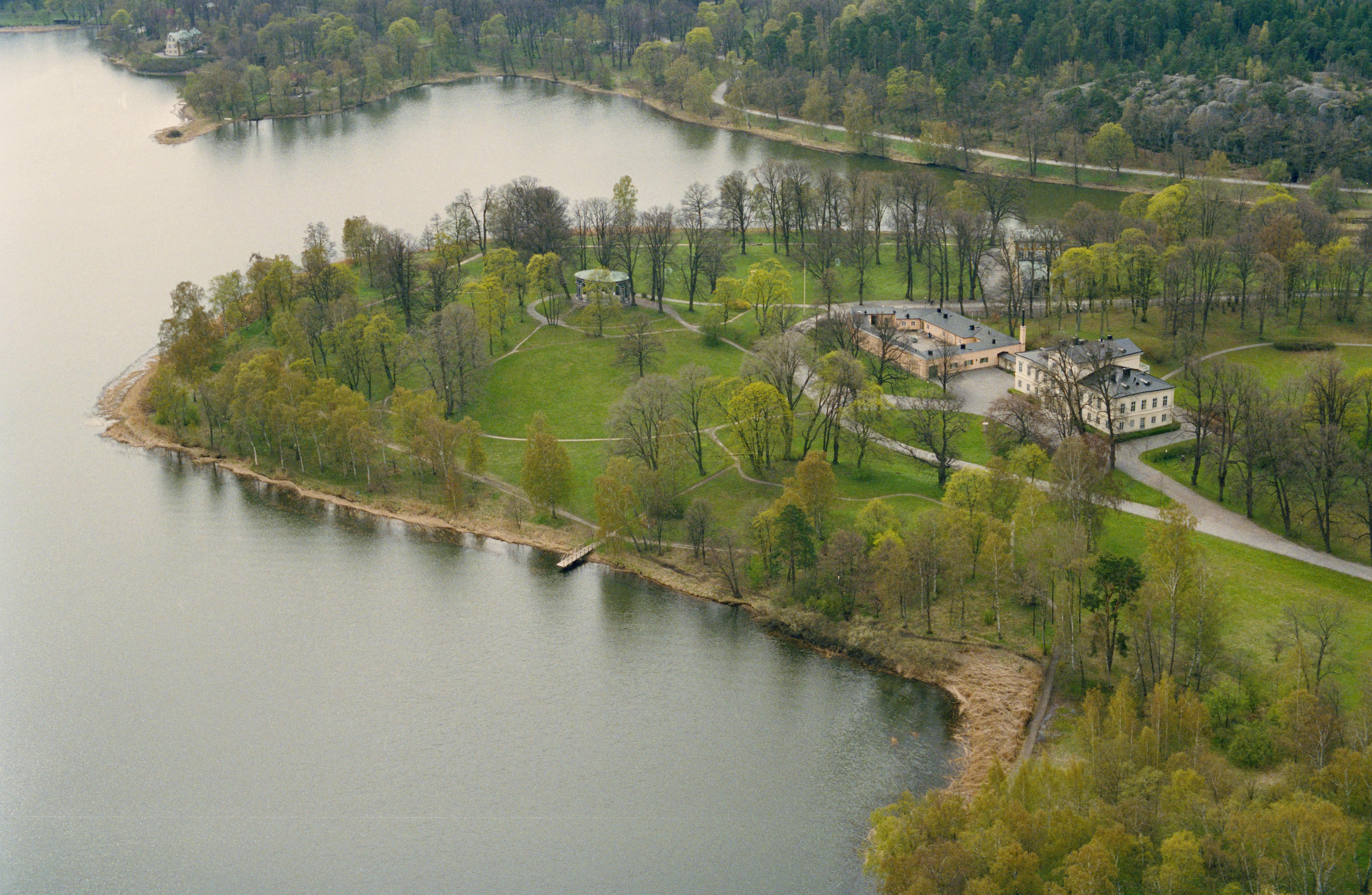 Beskrivning: Hagaparken vid Brunnsviken. Haga slott, Gustav III:s paviljiong och Ekotemplet byggnadsminne RAÄnr Solna 30:1-3. Bilden är tagen mot (väderstreck): SV