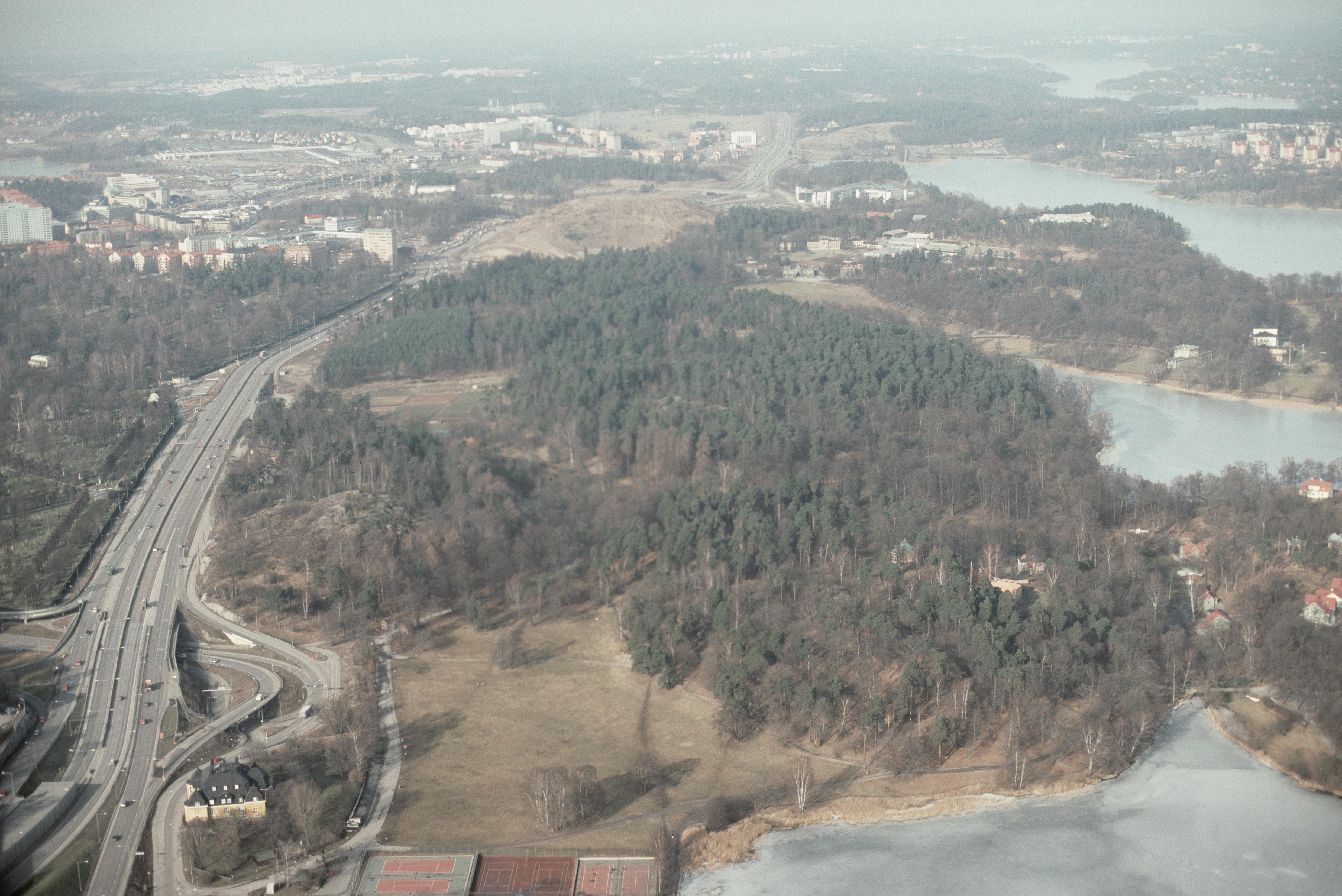 Beskrivning: Gamla Haga i Hagaparken vid Brunnsviken. Haga Tingshus nere till vänster. Till höger villorna Japan, Kina, Kinesiska paviljongen, Valhalla, Ädelsten m.fl. I bildens övre del Haga slott RAÄnr Solna 30:1. Bilden är tagen mot (väderstreck): NV