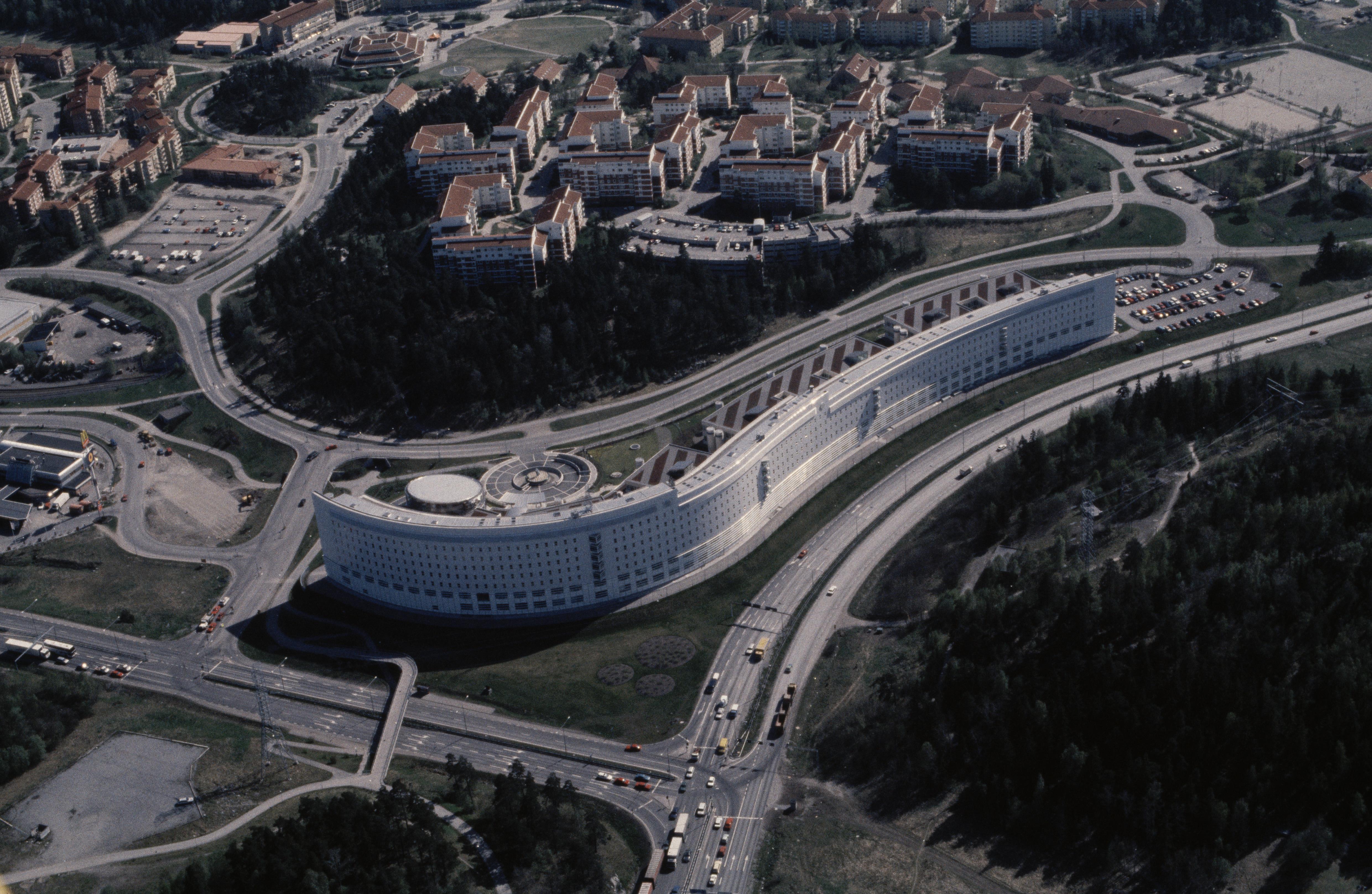 Beskrivning: Området Rissne vid Ulvsundavägen som markerar gränsen mellan socknen Sundbyberg (i bildens övre del) och Stockholm (nere till höger). Vid bildens mitt byggnaden Bankhus 90 i Rissne. Bilden är tagen mot (väderstreck): S