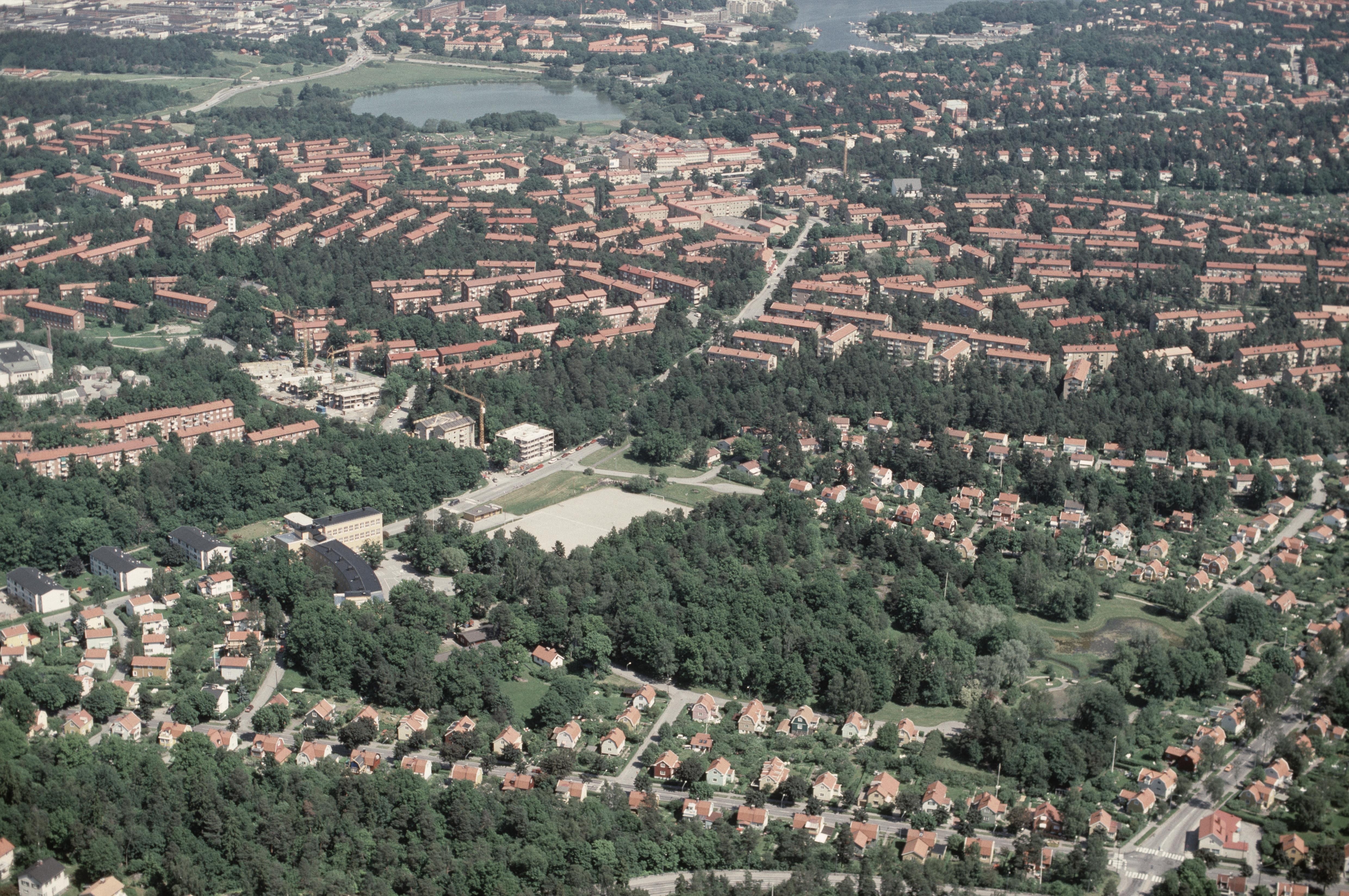 Beskrivning: Området Olovslund i stadsdelen Bromma i Stockholms Västerort. Till vänster under bildens mitt Olovslunds skola vid Olovslunden med stensättningar RAÄnr Bromma 10:1-2. I bildens övre del området Abrahamsberg mot Lillsjön och Ulvsundasjön i Mälaren och längst upp Solna socken. Bilden är tagen mot (väderstreck): NO