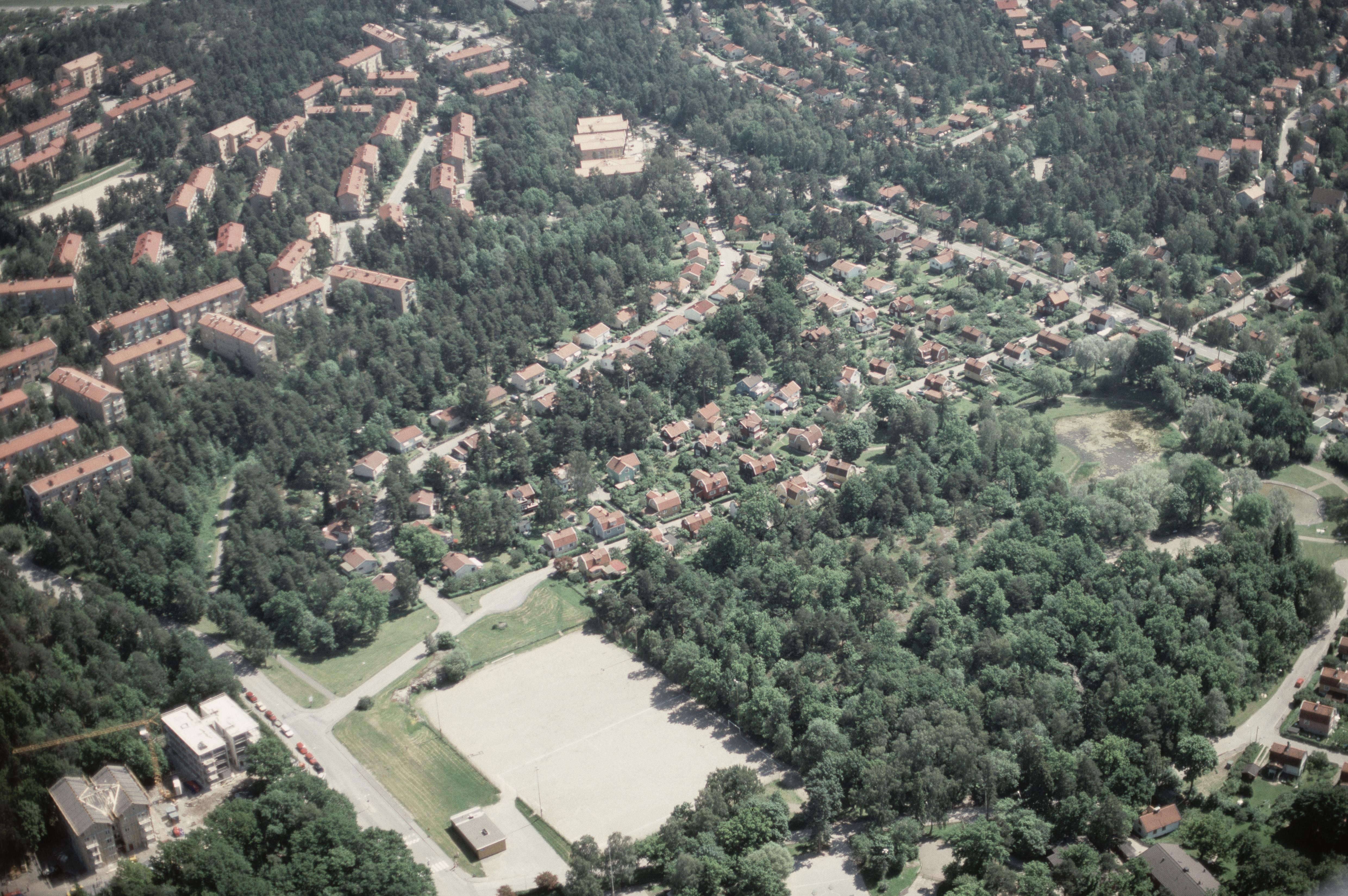 Beskrivning: Området Olovslund i stadsdelen Bromma i Stockholms Västerort. Till höger om bildens mitt Olovslunden med stensättningar RAÄnr Bromma 10:1-2. Bilden är tagen mot (väderstreck): SO