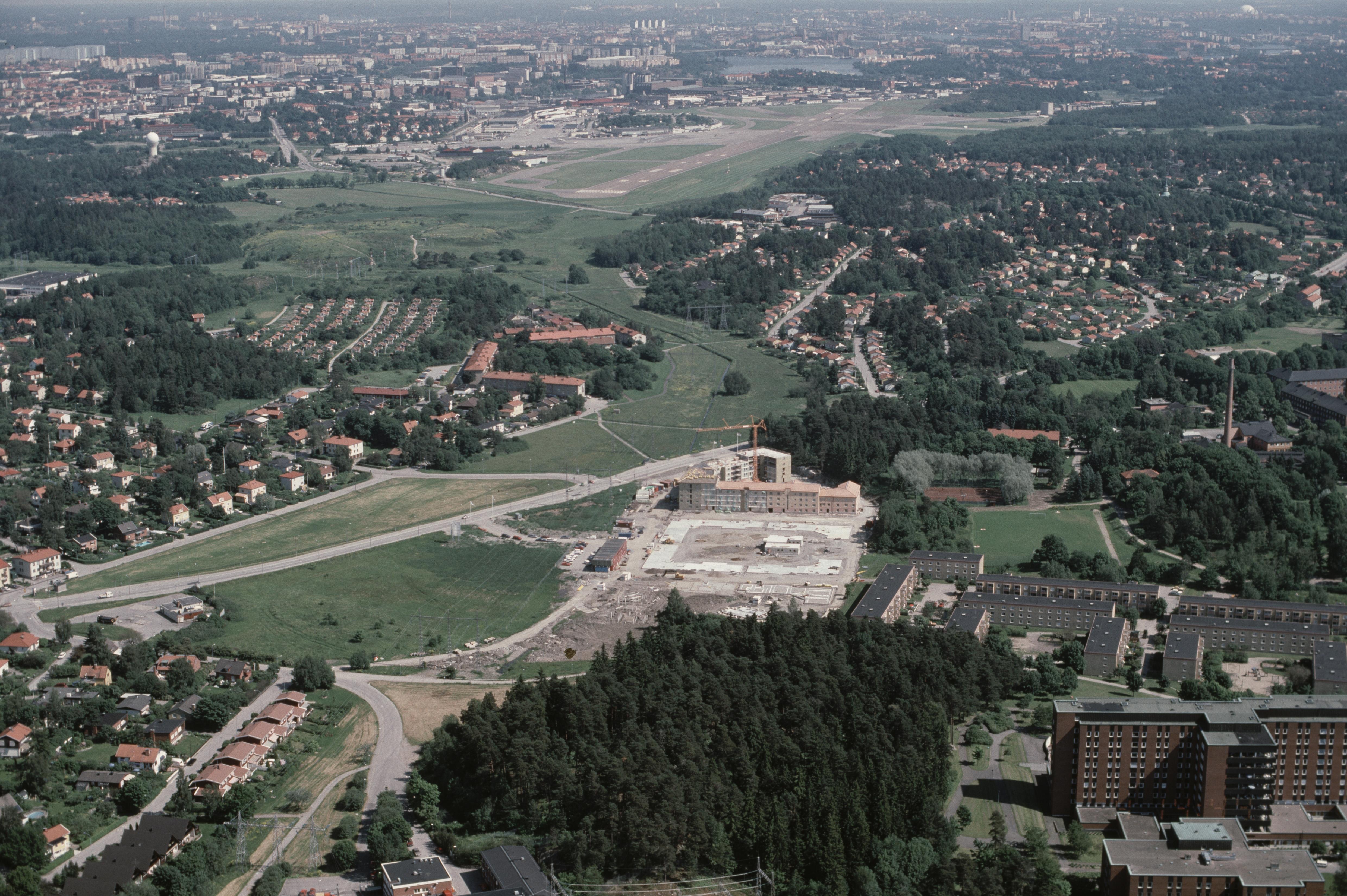 Beskrivning: Områdena Flysta, Sundby och Beckomberga. Till vänster om bildens mitt koloniträdgård vid Sundby. I bildens övre del Bromma flygplats mot Stockholms stad. Bilden är tagen mot (väderstreck): Ö