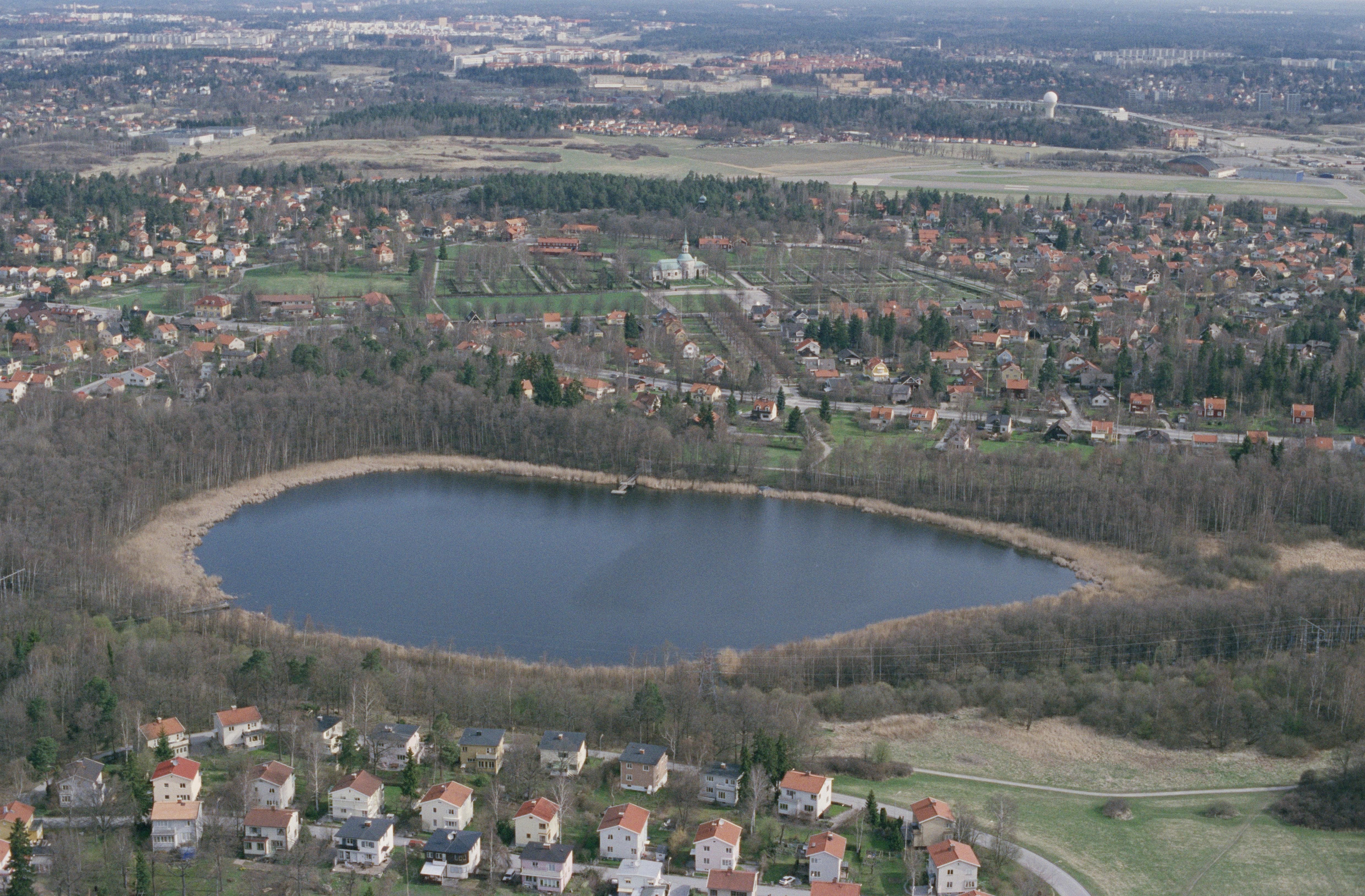 Beskrivning: Kyrksjön i stadsdelen Bromma i Stockholms Västerort. I bildens nedre del området Norra Ängby. Vid bildens mitt Bromma kyrka med medeltida kyrkotomt RAÄnr Stockholm 992. Bilden är tagen mot (väderstreck): NNO