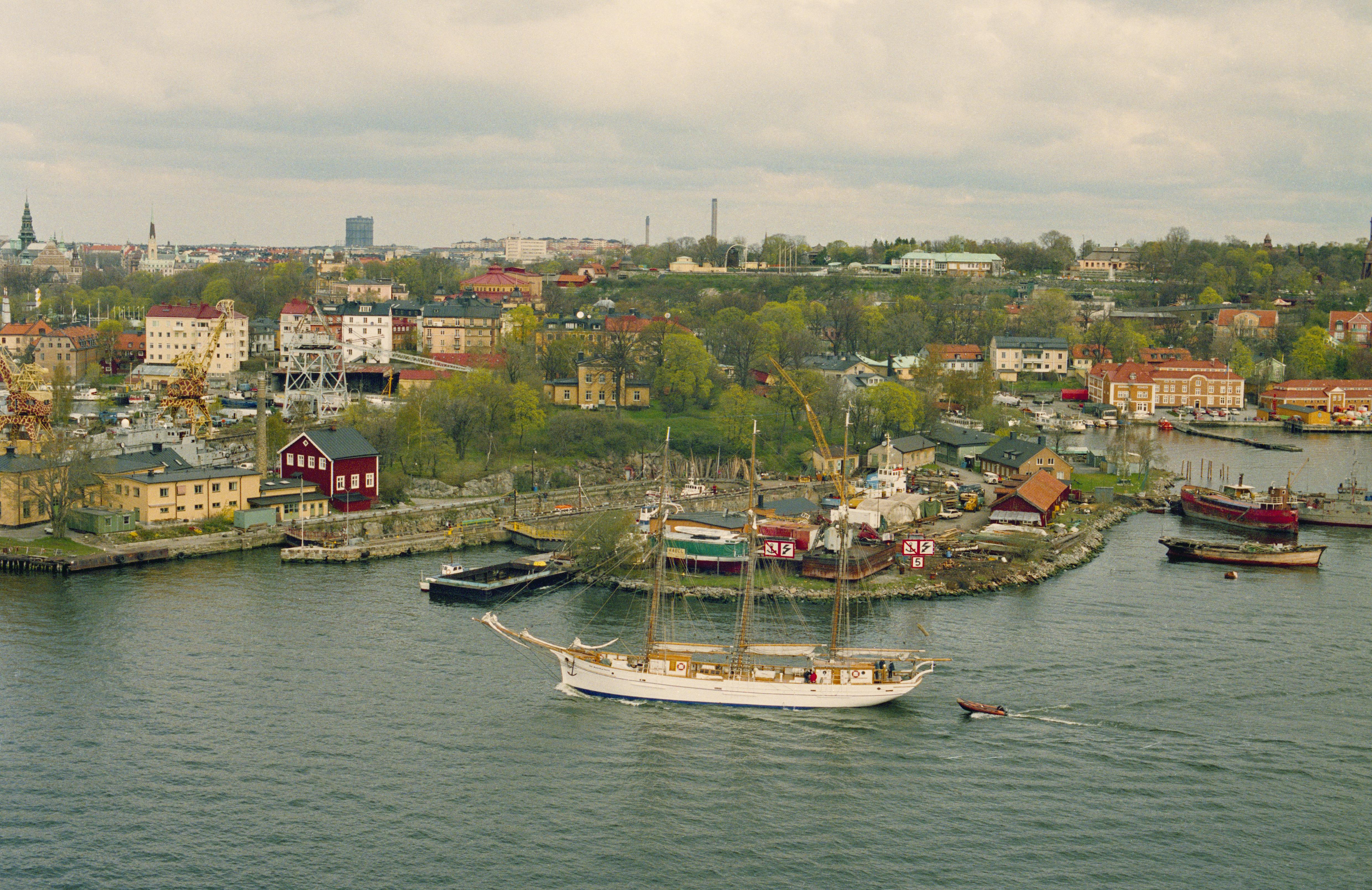Beskrivning: Båten / segelfartyget "Blå Marité" i Saltsjön. Vid bildens mitt Beckholmen med varv - byggnadsminne RAÄnr Stockholm 130:1. I bildens övre del nöjesfältet Gröna Lund, Vasamuseet, Nordiska museet, Stockholms innerstad med Östermalm / Strandvägen, m.m. Bilden är tagen mot (väderstreck): NV
