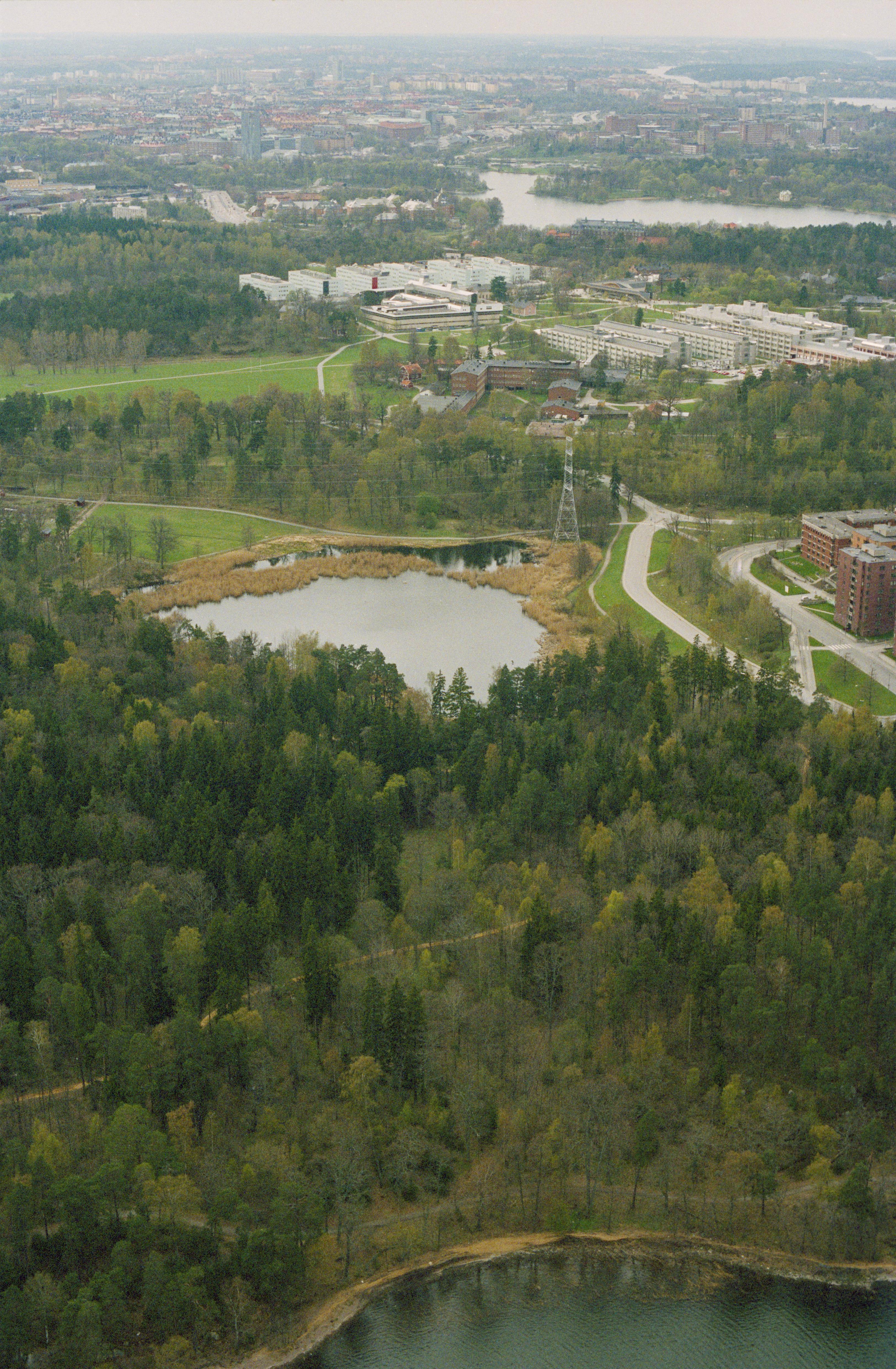 Beskrivning: I bildens nedre del fjärden Lilla Värtan och stensättning RAÄnr Stockholm 117:1. Vid bildens mitt sjön Lappkärret och bostadsområdet Lappkärrsberget. Över bildens mitt Stockholms universitet m.fl. vid Brunnsviken. I bildens övre del Stockholms innerstad. Bilden är tagen mot (väderstreck): SV