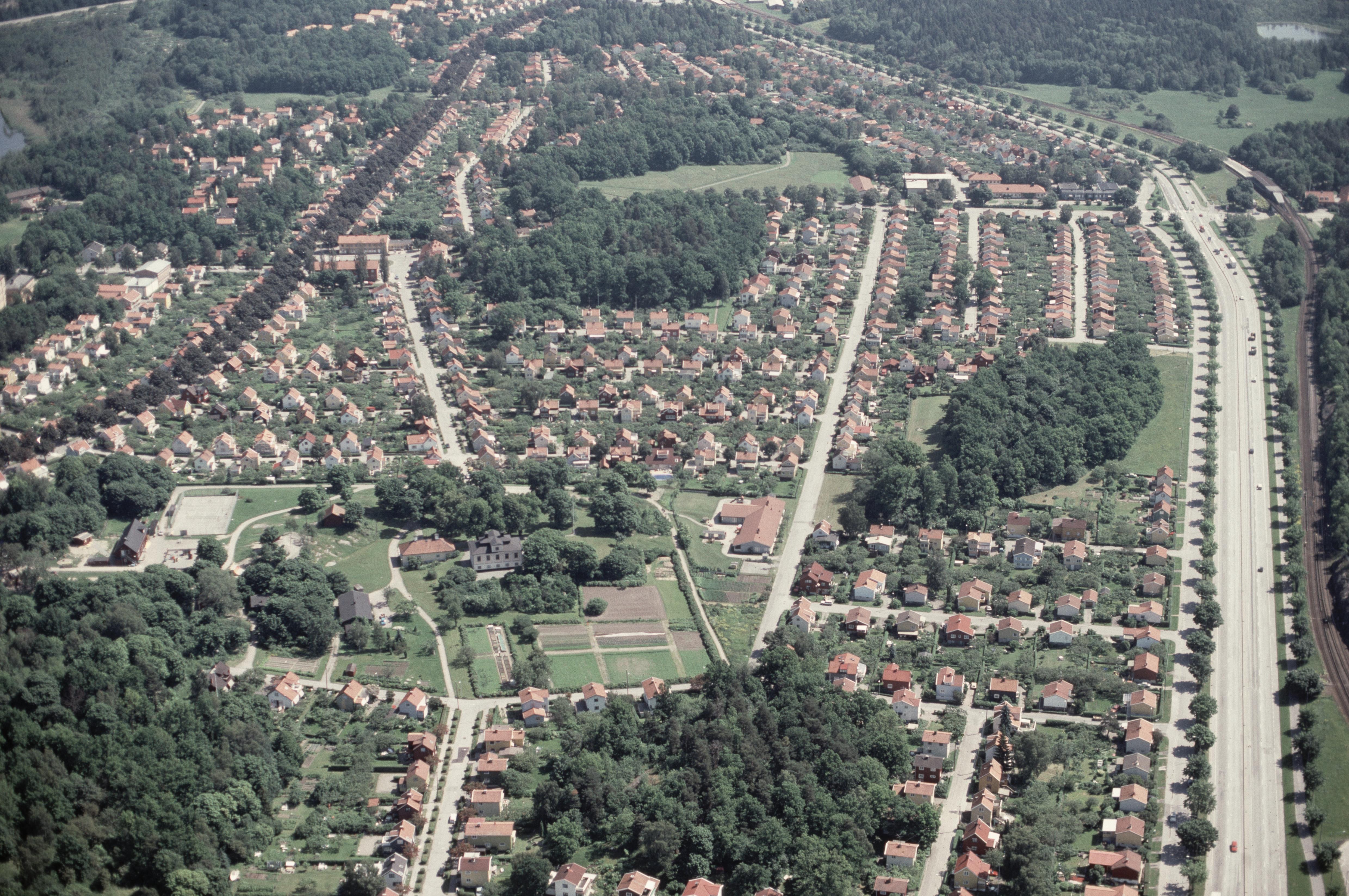Beskrivning: Stadsdelen Bromma i Stockholms Västerort. Området Norra Ängby med Bergslagsvägen längs bildens högra kant. I bildens nedre del till vänster Stora Ängby herrgård och gravfält Björklunds hage RAÄnr Bromma 62:1. Bilden är tagen mot (väderstreck): SO