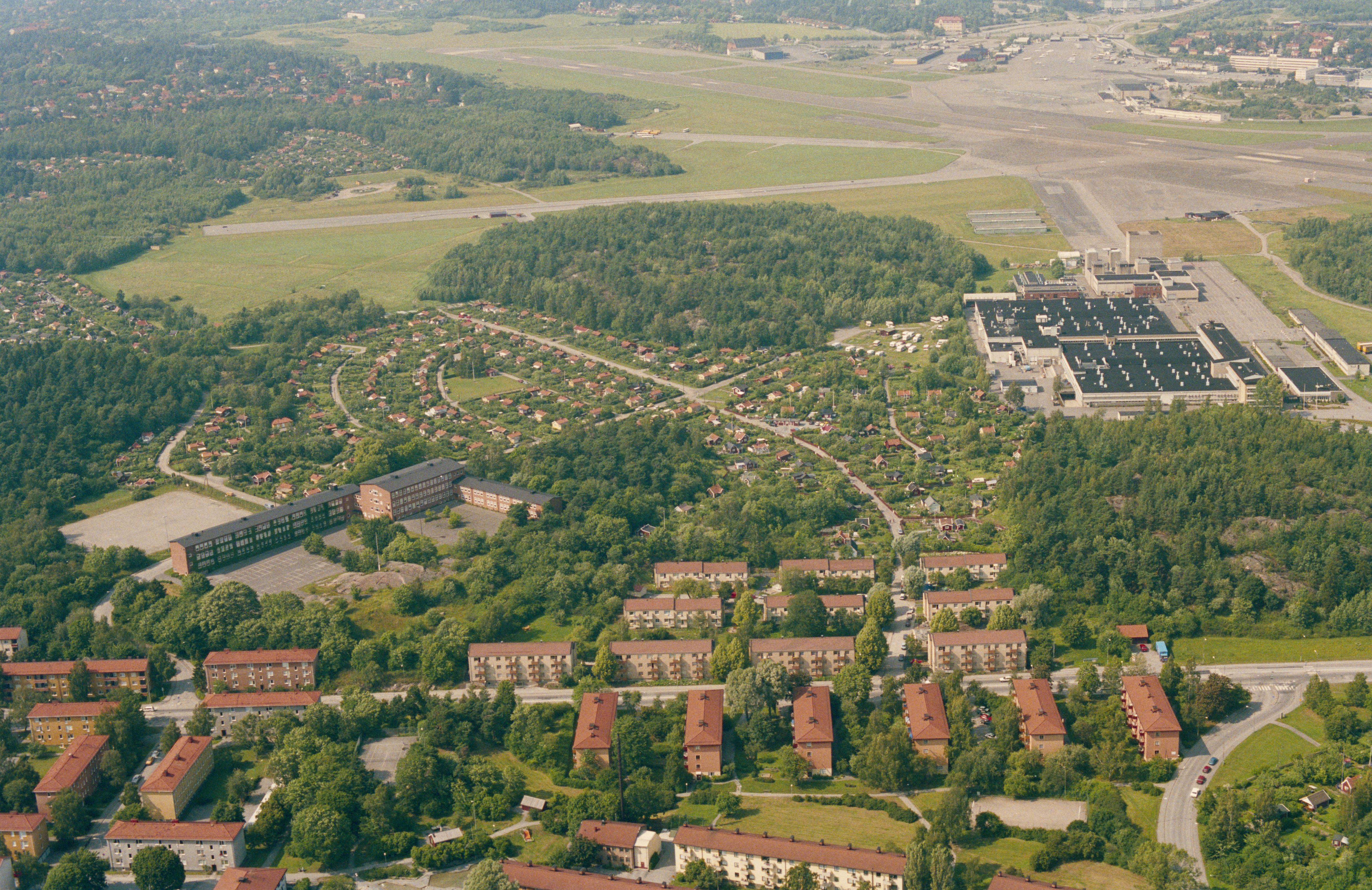 Beskrivning: Riksby koloniområde i stadsdelen Bromma i Stockholms Västerort. Över bildens mitt gravfält RAÄnr Bromma 32:1. Bilden är tagen mot (väderstreck): NNV
